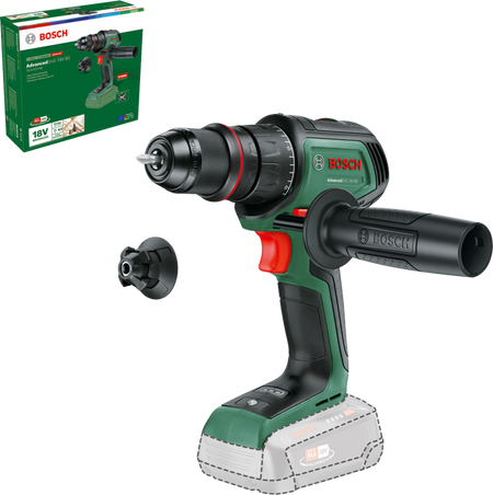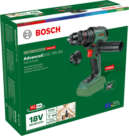 This cordless drill driver combines powerful drilling and screwdriving with flexibility. The detachable 13 mm metal chuck accommodates various accessories and the handy QuickSnap interface enhances its versatility. Joint-friendly work is achieved with the help of an additional handle. The Bosch AdvancedDrill 18V-80 unites powerful drilling and screwdriving with optimal flexibility. With a mighty 78 Nm maximum torque and variable speed, it effortlessly tackles any task - from pilot holes to driving screws, bolts, or fasteners into wood, metal, or plastic. This robust tool is built to endure thanks to a brushless motor and detachable metal chuck. The 13 mm chuck accepts various drill and screwdriver bits, hole saws, and accessories. Affixing the magnetic cap is a handy feature for every screwdriving application as screws don’t have to be held in place by hand. This high-performance drill driver has a QuickSnap interface so the drill chuck can be changed and, additionally available attachments to reach narrow spaces can be used. An auxiliary handle enhances operational control and stability, meaning added comfort and less fatigue. The built-in Bosch Syneon Technology provides optimum power and maximum runtime. The tool belongs to the 18V POWER FOR ALL system. One battery can be used in all 18V POWER FOR ALL tools.