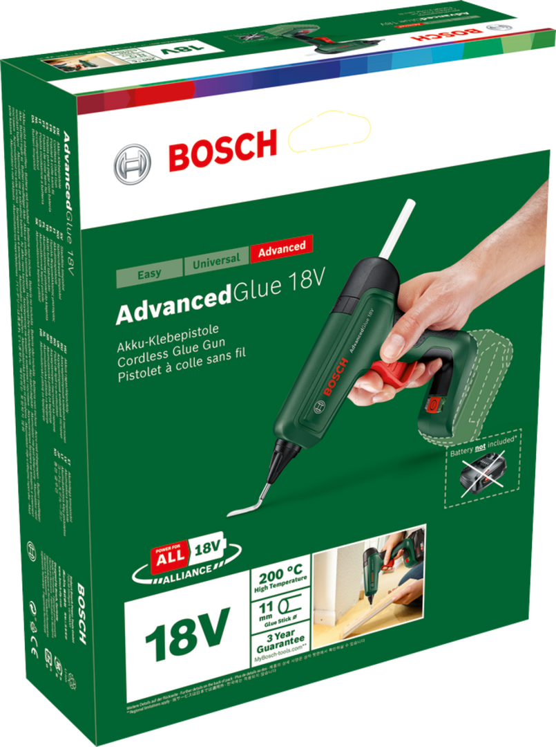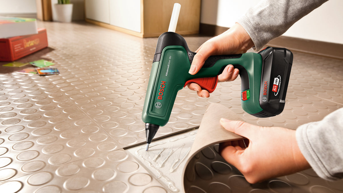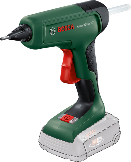 For tough repair jobs or delicate craftwork, the cordless AdvancedGlue 18V is the powerful hot glue gun all-rounder. Warmed up and ready for action in just 90 seconds and with two temperature modes, this handy tool delivers constant high heat for optimal adhesion and a lower temperature for sensitive materials. The AdvancedGlue 18V is a powerful, cordless hot glue gun that matches the strong performance of a corded tool and is compatible with the Bosch 18V battery system. In just 90 seconds, the gun is heated up and ready for use. It provides optimal adhesive bonding for perfect jointing as well as sufficient correction time thanks to Bosch’s constant, high-temperature heating technology. With dual-temperature mode, 200 °C provides maximal adhesion on DIY or repair jobs while 130 °C is ideal for heat-sensitive project work. This smart tool saves energy too, switching off when it detects inactivity.