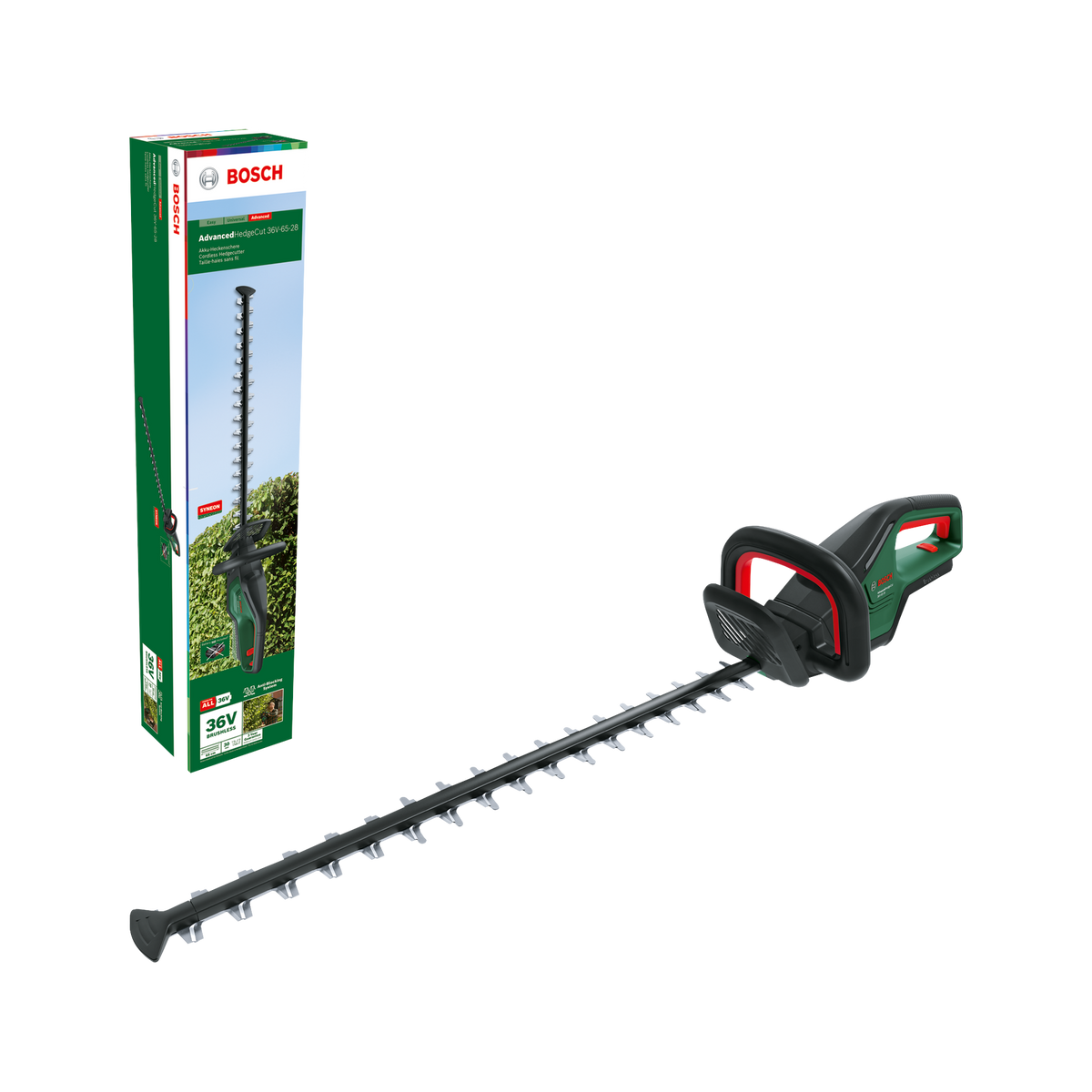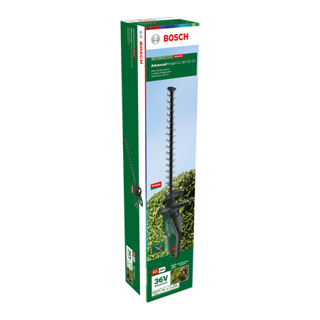 The cordless AdvancedHedgeCut 36V-65-28 tackles dense hedges and bushes with ease. The brushless motor combines powerful performance with maximum efficiency, while less motor heat enables longer service life. As it’s light to handle, this tool puts less strain on gardeners’ backs, shoulders, and wrists. The Bosch-patented Anti-Blocking System avoids potential jamming, ensuring continuous cutting and less downtime. This is the all-rounder for cutting all hedges, including hawthorn, berberis, or blackthorn hedges, and for branches up to 28 mm. The tool belongs to the 36V POWER FOR ALL system. One battery can be used in all 36V POWER FOR ALL tools.