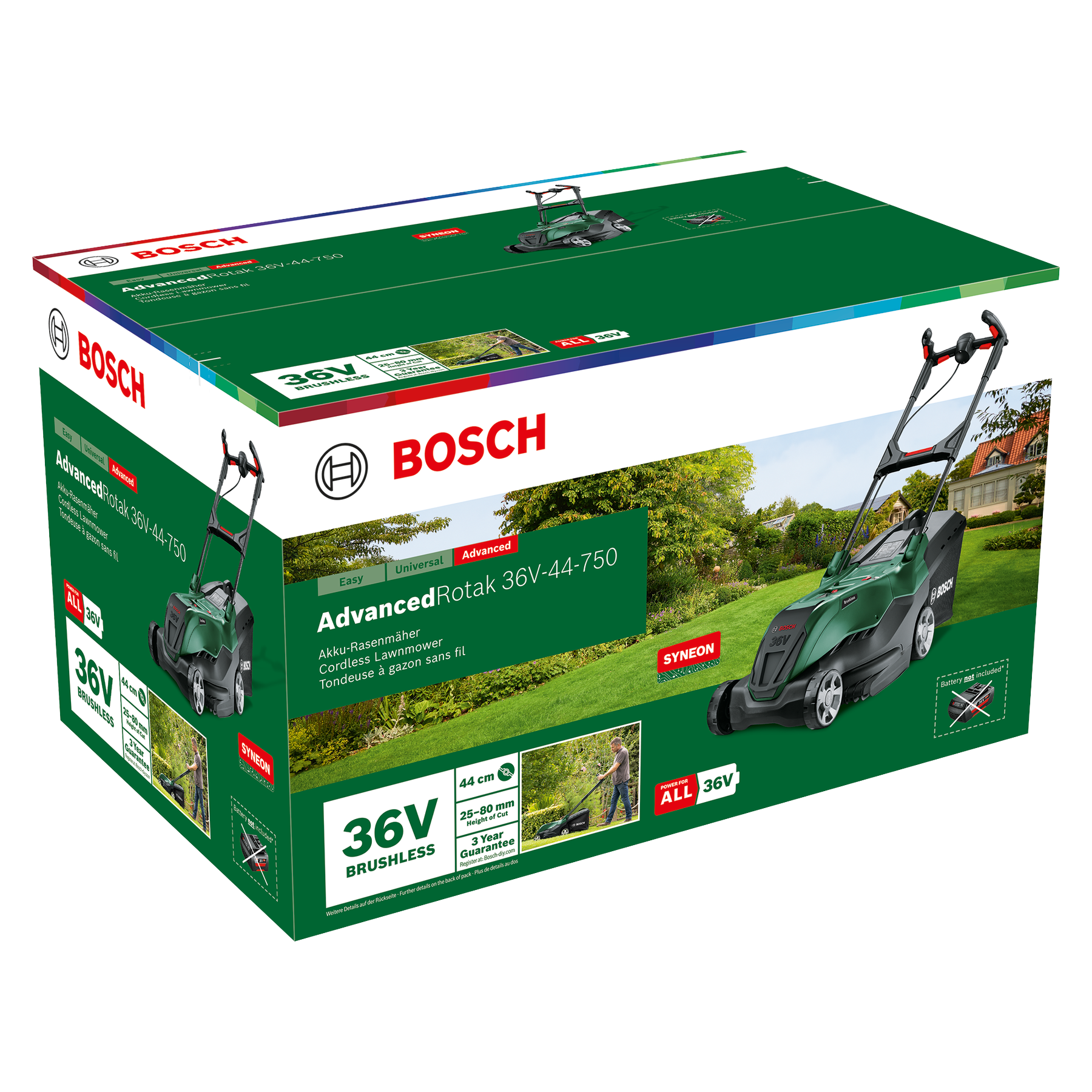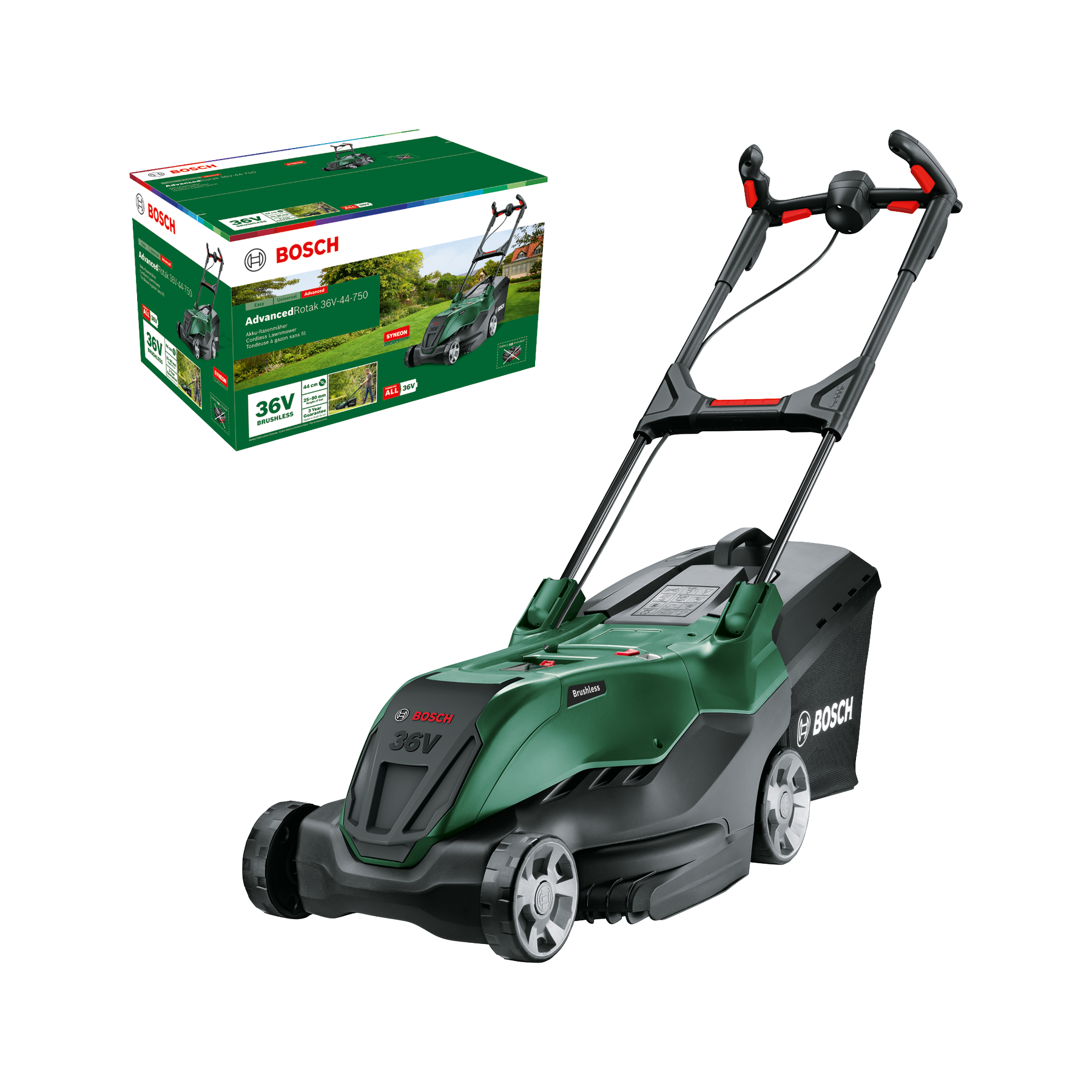 The AdvancedRotak 36V-44-750 battery is compatible with all products in the Bosch Home & Garden 36V system as well as other POWER FOR ALL ALLIANCE partner products. It's brushless motor ensures superior performance and longer lifetime. The comfort of pram handles with a bail-bar grip zone delivers a convenient and ergonomic mowing experience for the user.
