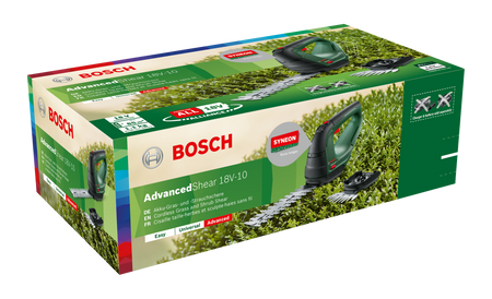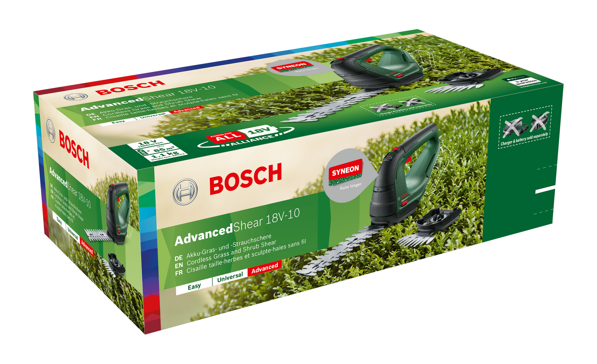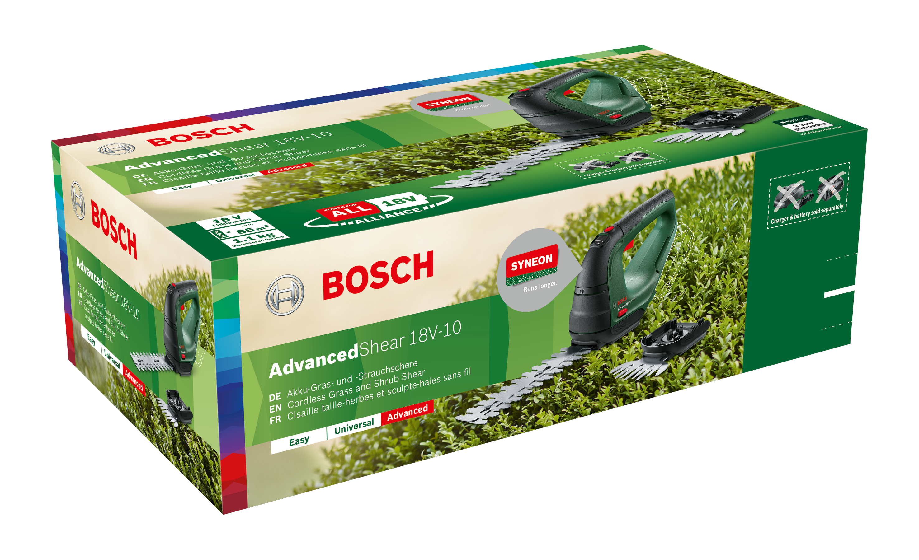 The versatile cordless AdvancedShear 18V-10 is designed for single-handed use, offering blades for shaping and maintaining or edging and trimming. Due to its 18V POWER FOR ALL battery, it provides the strongest cutting performance in its range. The patented Anti-blocking system and the Swiss-made dual-action blades ensure impressive precision as well as continuous cutting with no jamming on thick branches. Capable of up to 70 minutes of battery runtime, this grass and shrub shear makes working towards the perfect garden even more convenient.