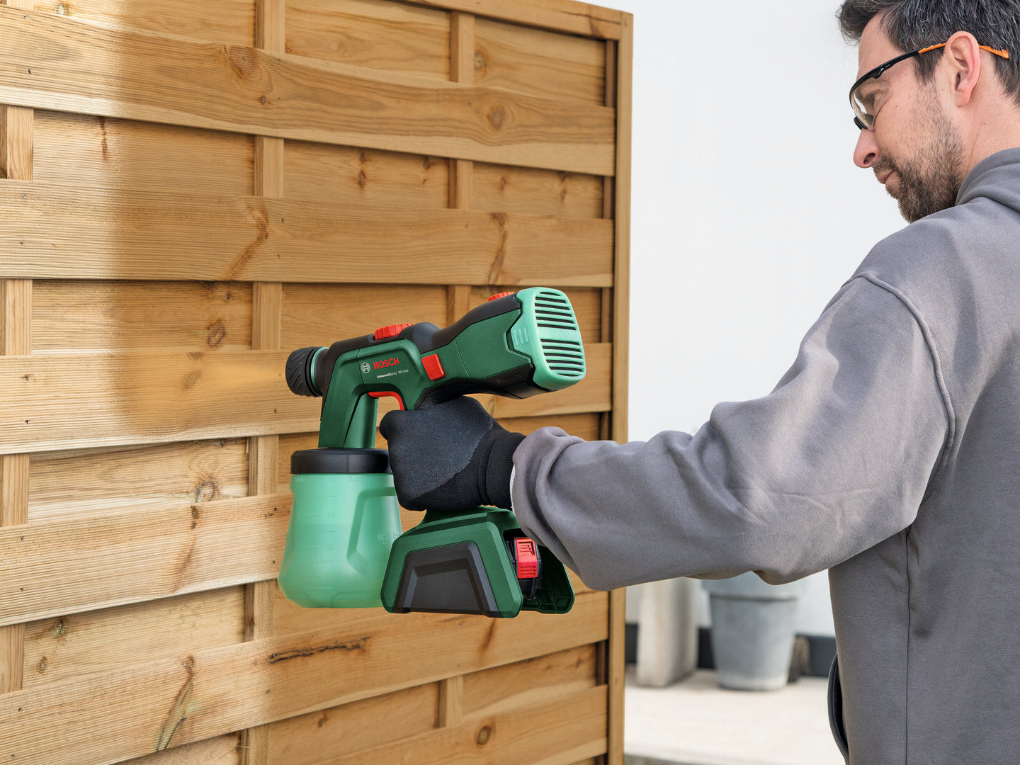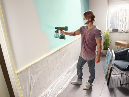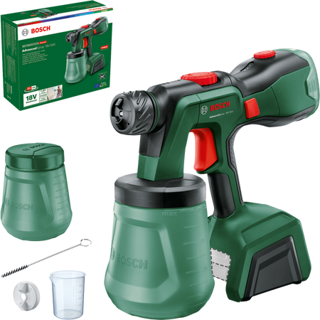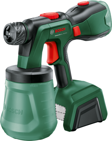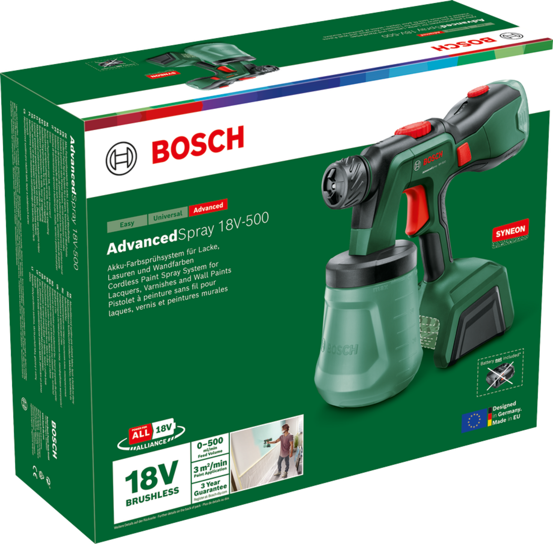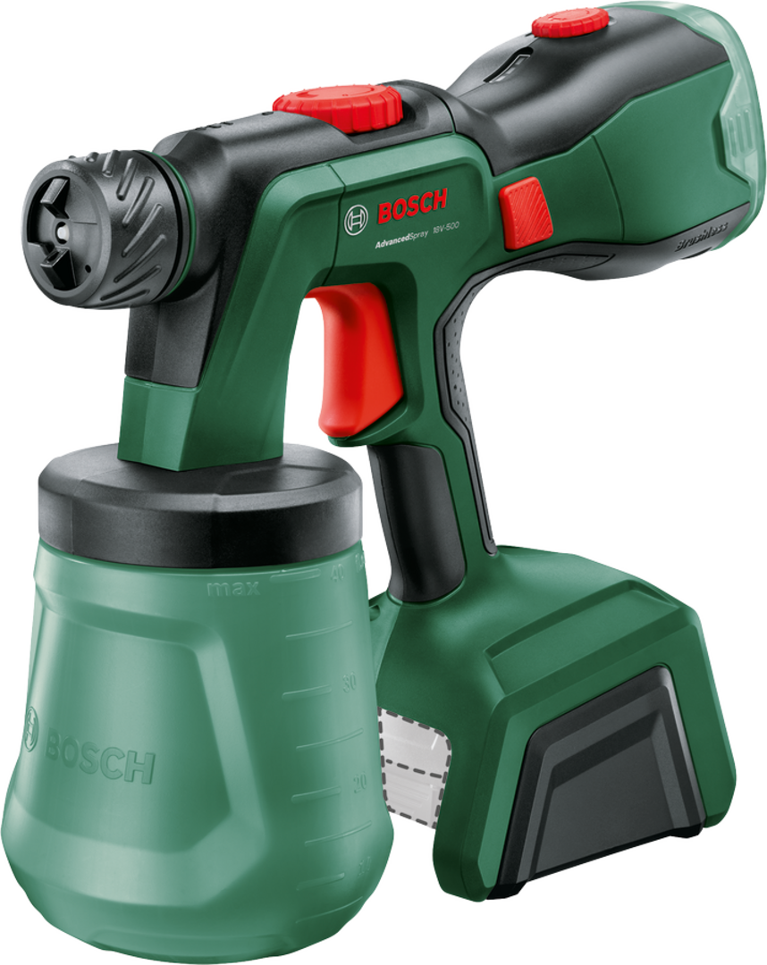 For maximum flexibility and fast painting with excellent results, indoors and outside, it’s got to be the highly performance cordless AdvancedSpray 18V-500. Simple to use, this powerful and energy-efficient tool can spray all types of paint through just one nozzle to create a superior finish with even coverage. On big and small projects, get a professionally painted look indoors and outside on furniture, fittings, or decks with the very powerful, energy-efficient AdvancedSpray 18V-500 paint sprayer. This is the cordless, high-volume, low-pressure sprayer of choice for DIY enthusiasts who want to move around freely while enjoying an exceptional and fast painting performance. With its powerful brushless motor and cutting-edge AirBoost Technology, this robust tool sets new standards for cordless spray painting and even distribution of the paint. For ultimate flexibility, there are two air caps: one for a top finish and one for speedy progress. This electric paint sprayer also stands out by having only one nozzle: the innovative ALLPaint nozzle can spray any type of varnish, lacquer, or wall paint. For an excellent painted finish, the paint and air volume can be finely adjusted via EasySelect and stepless thumb wheels. The tool belongs to the 18V POWER FOR ALL system. One battery can be used in all 18V POWER FOR ALL tools.