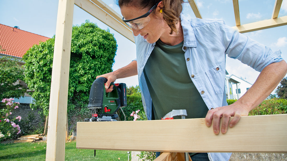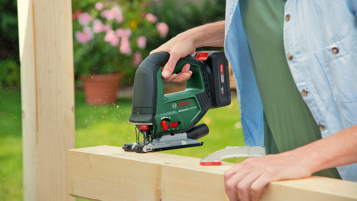 The Bosch AdvancedSaw 18V-140 is a robust, powerful, and highly versatile cordless jigsaw. When working on big DIY projects, where high performance and deep cuts are required, it delivers top results on wood, metal, or plastic. When cutting beams, making furniture, or undertaking other challenging projects, the Bosch AdvancedSaw 18V-140 is the high-quality cordless jigsaw of choice for DIY enthusiasts. Thanks to a brushless motor, it unites a powerful performance, comparable to a corded saw, with a longer motor lifetime. For best results, this all-rounder leads with a cutting depth of up to 140 mm and efficient sawing of straight or curved cuts in wood, aluminium, metal, and plastic. For clear visibility of the cutting line and a cleaner work environment, this saw has a nozzle that removes up to 85 % of dust and chips directly at the saw blade. A one-hand SDS interface facilitates fast and effortless exchange of blades, for a seamless working flow. The built-in Bosch Syneon Technology provides optimum power and maximum runtime. The tool belongs to the 18V POWER FOR ALL system. One battery can be used in all 18V POWER FOR ALL tools.