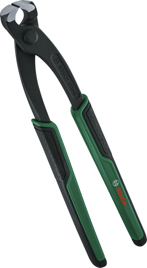 The high-performance Bosch Concreters’ Nippers 225mm are the perfect tools for demanding DIY tasks such as twisting and cutting wires. With hardened edges of 60 +/-2 HRC, a compact head design and long handles for high leverage and effort-saving, these nippers are perfect for a variety of precision applications such as twisting wires and flush cutting in tight spaces. Made from durable chrome vanadium steel with a black phosphate finish, they are built to last and resist rust, ensuring durability. The ergonomic design and softgrip handles ensure maximum control, power transmission and comfort. The smooth hinge enables easy and precise opening and closing.