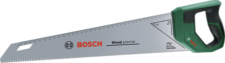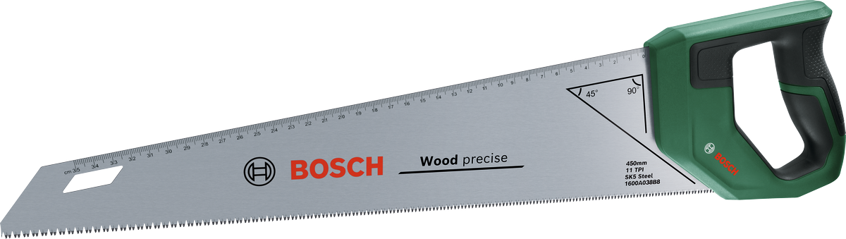 Build cabinets or cut longitudinal grooves with the outstanding performance of the Bosch Handsaw 450mm. For optimal force and tactile control, this saw features an ergonomic handle with a softgrip. The unique handle design is derived from the long-term Bosch expertise of cordless screwdriver handle designs. The versatile handsaw makes fine cuts in in materials such as soft wood, laminate, decorative trims and dowels thanks to its high-quality SK5 steel blade with 11 TPI. Induction-hardened 3 PT triple ground ultra-sharp teeth and a robust 61-68 HRC hardness boost the blade’s cutting precision and enhance the handsaw’s lifespan. Sawing is smooth and comfortable with this tool. Using the handy backwards running 35 cm metric scale on the saw and the 45deg and 90deg marking support, measurements can be marked directly on the workpiece. Thanks to a reuasable blade guard, this handsaw is safe to transport and store.