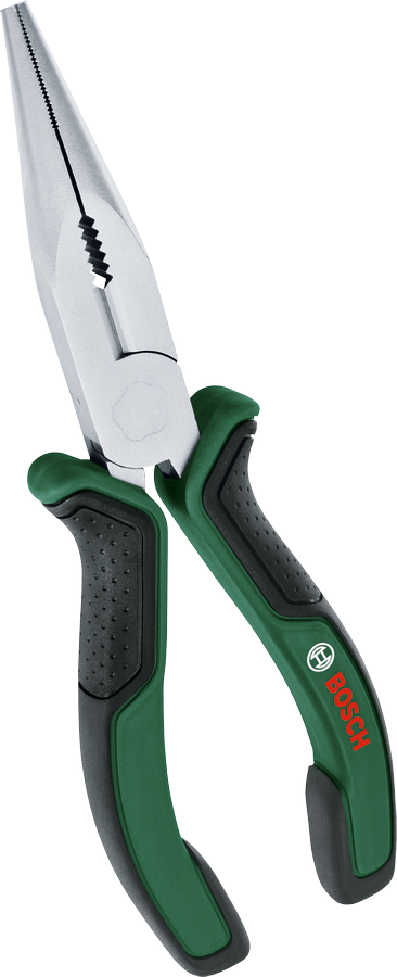The first-class Bosch Long Nose Pliers 180mm make DIY work easy and efficient. Thanks to the large softgrip surfaces, they fit comfortably in the hand and have an ergonomic outer and patented inner shape that enables smooth opening and closing as well as optimum control when cutting, gripping and turning. Thanks to the composition of hard carbon steel and the high-quality matte chrome-nickel surface, which prevents rusting, the long nose pliers are very durable.