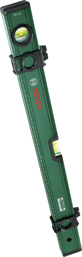 Ensure level long boards on the new terrace or bigger furniture pieces at home and straight pictures on the walls with the Bosch Spirit Level 60cm. It delivers highly accurate results up to 0,5 mm/m thanks to horizontal and vertical bubble levels. Reading the level is easy, thanks to bright fluorescent bubble liquid in the vials. This spirit level has a double-sided metric scale, from 0-57cm to use as a ruler and 2x 0-28cm to measure centered. Alignment tasks can be done from flat or curved surfaces thanks to the level’s V-groove and plane-milled bottom. The two marking sliders are practical for easily marking the leveled points at the correct distance while measuring. The hanging hole can be used to hang and store the spirit level when jobs are done. This tool is tough: DIY enthusiasts will appreciate the robust, light aluminum composition, reinforced ribs and protective end caps with soft-grip slip stoppers.