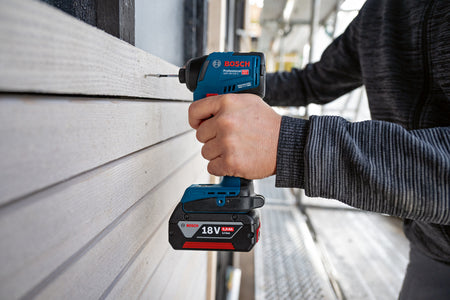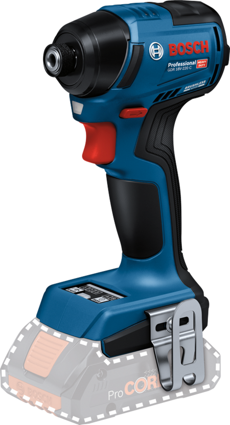 For smooth fastening of screws in wood and sheet metal, you need a tool that combines power with control. The GDR 18V-220 C Professional with ¼” hex drive is a high-torque, compact impact driver with additional features. With a head length of 113 mm, it is easier to handle especially when working in tight spots. Thanks to a powerful brushless motor with up to 3,400 RPM, three-speed settings, and a high torque of 220 Nm, you will get your work done faster and with more control. The tool’s adjustable screw modes ensure controlled application to prevent broken screwheads and damaged work pieces by slowing down (A) or shutting off (B) the impact driver. Additional modes can be accessed and adapted via the Bosch Toolbox App. You only need one hand to insert bits – just push the bit in to lock it. The double ball bearing ensures a firm hold of the bit and increases precision. With its two LED lights, one at the head and one at the foot of the driver, you get best-in-class workplace illumination. The tool’s all-metal gear housing is what professionals ask for. The tool has a status indicator and a belt clip. It is compatible with the Bosch Professional 18V System and with the multi-brand battery alliance AMPShare. , Use this powerful and compact impact driver for top results on HVAC projects, electrical work, or carpentry.