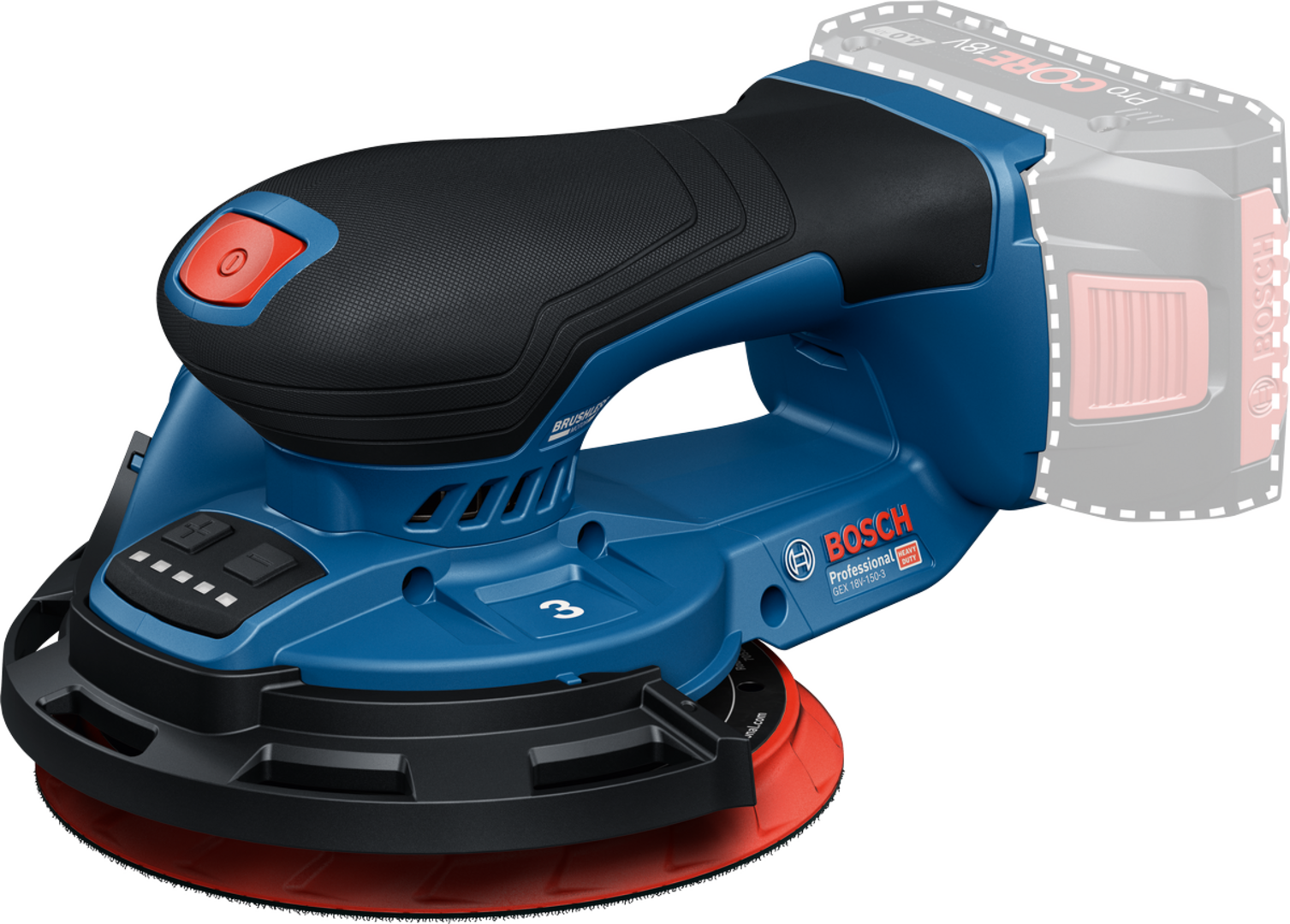 The GEX 18V-150-3 Professional random orbit sander’s outstanding balance and gripping area close to the workpiece offers optimal control in all working positions. Its excellent ergonomics make it easy to use with one or two hands for less-fatigue sanding over a longer period. This sander is extremely efficient with high removal rates thanks to its brushless motor and 3 mm orbit. Plus, there’s significantly less dust with the pad’s integrated Venturi Air Channels and the innovative dust box with integrated Click&Clean interface. Thanks to the HMI, operation is very simple and intuitive. The GEX 18V-150-3 Professional is ideal for removing wood, paint and lacquer as well as intermediate sanding and fine sanding of surfaces. It is compatible with all 18V batteries, ideally ProCORE18V 4.0Ah for a perfect balance. The GEX 18V-150-3 Professional features a dust box, speed selection, battery status indication and guard ring as well as 150 mm sanding pad.