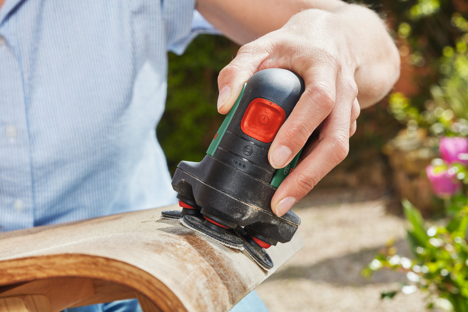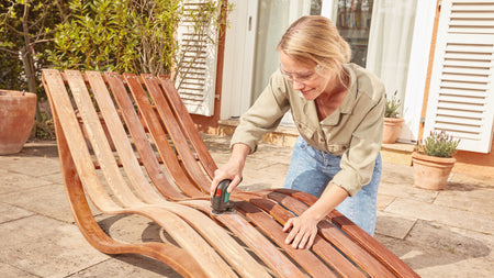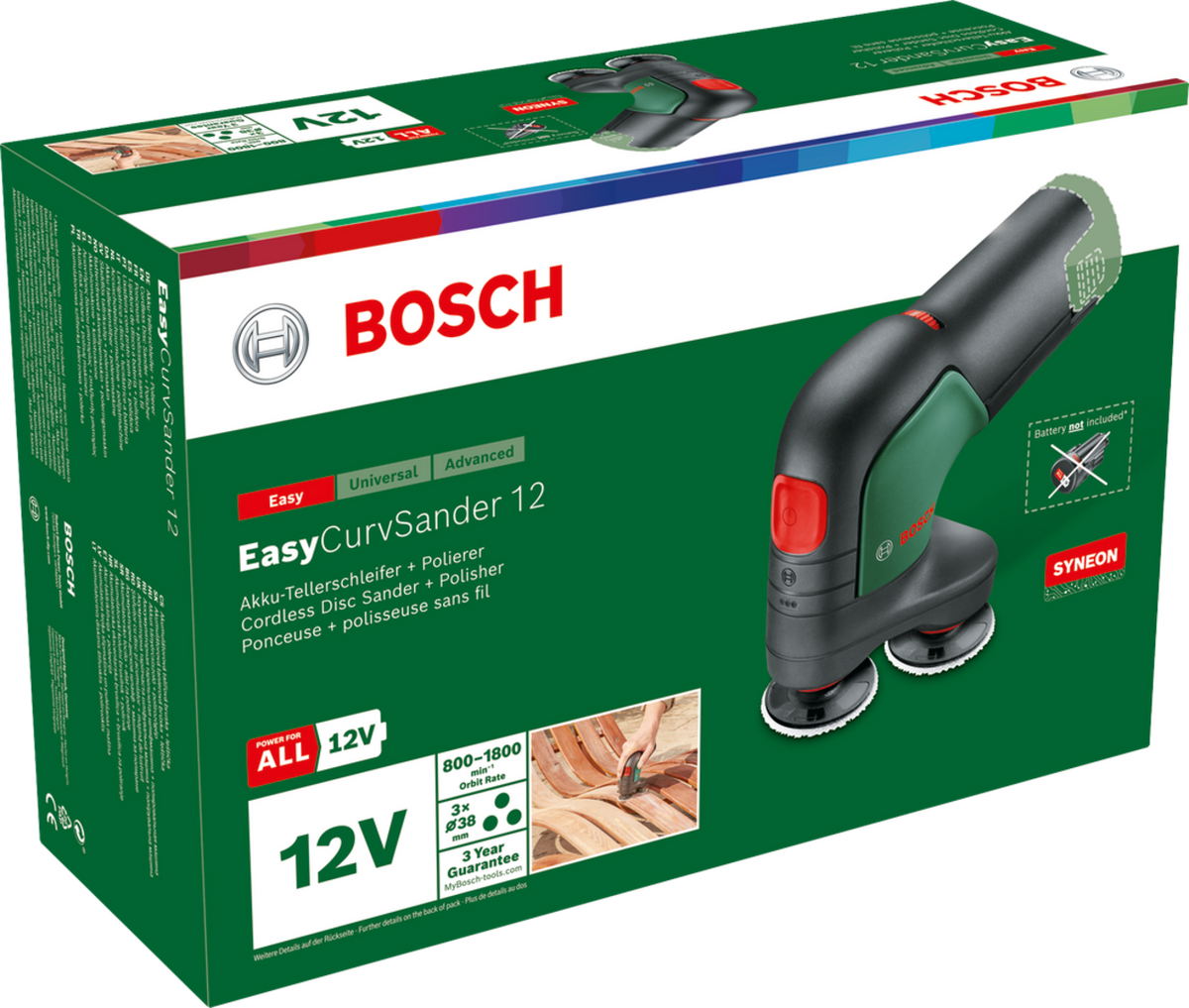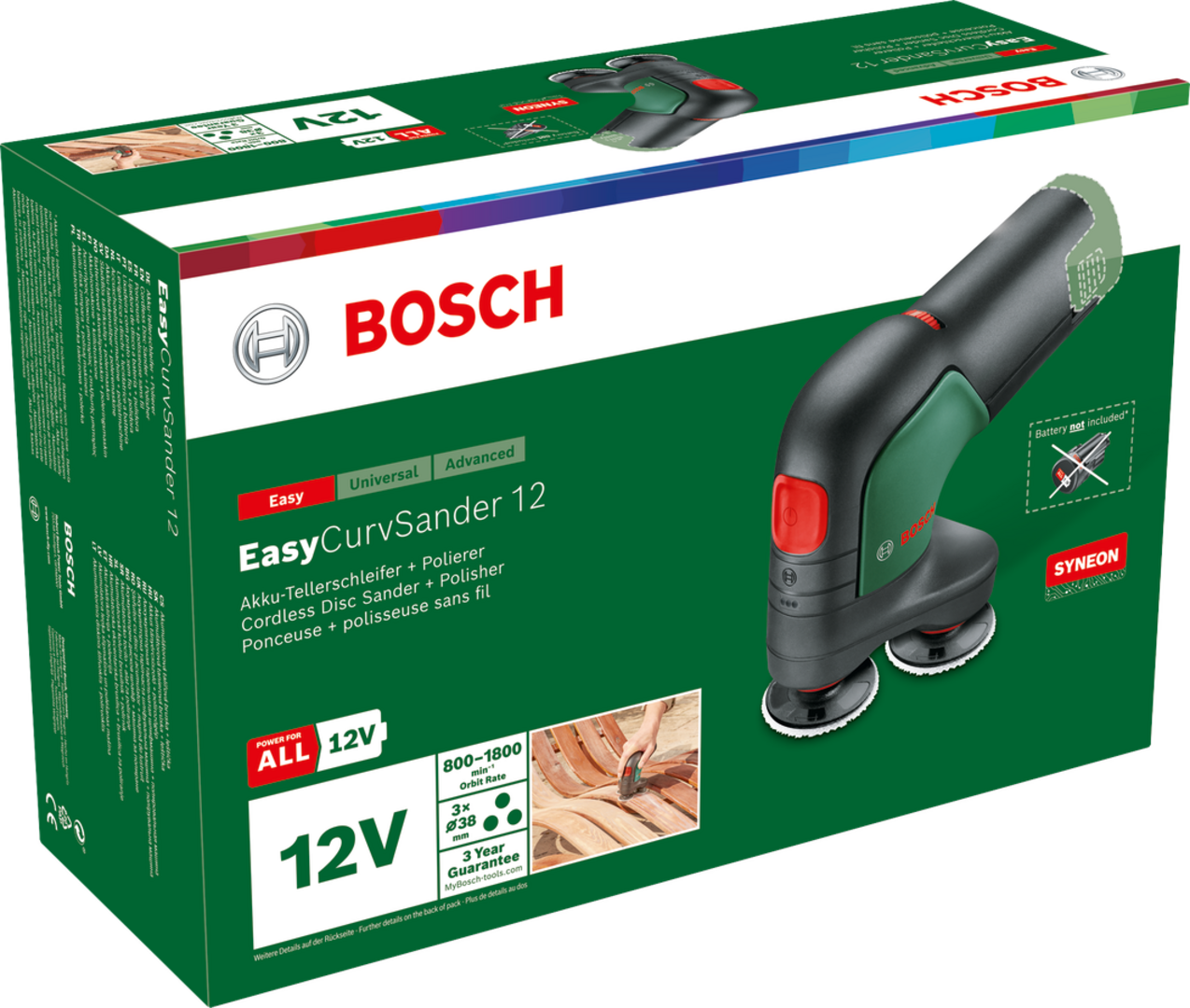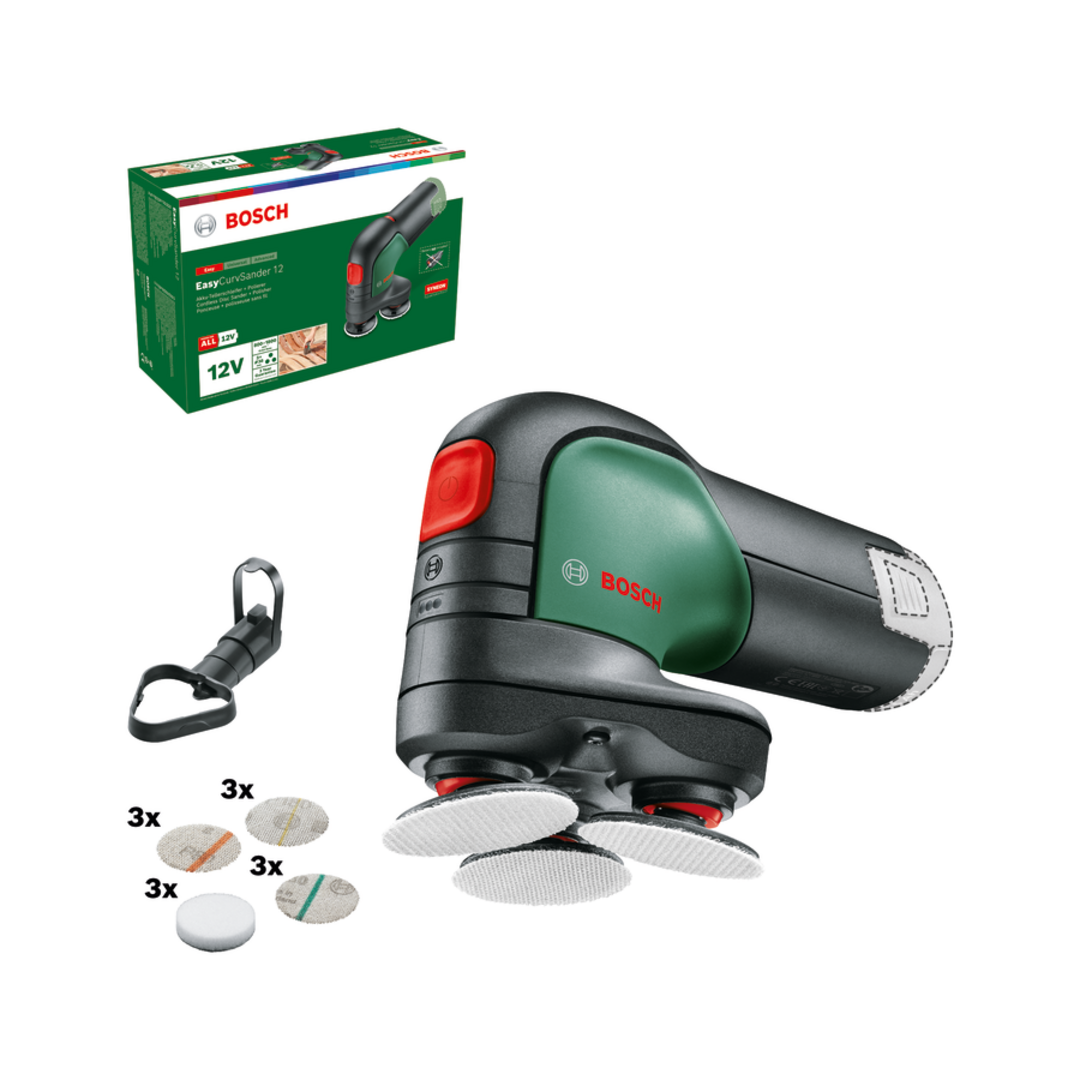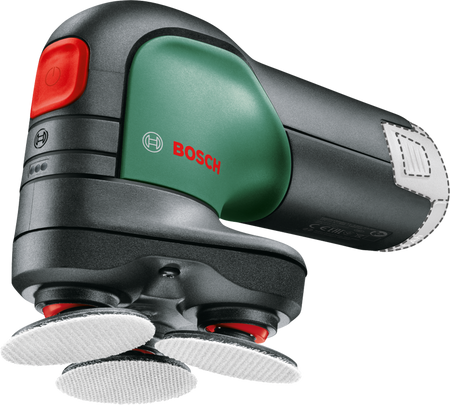 The EasyCurvSander 12 is the very first cordless disc sander and polisher. Smooth operation with three rotating, movable discs for sanding and polishing flat, curved, and rounded surfaces. Its durable sanding nets ensure high material removal rates and excellent surface quality across a complete range of applications. Thanks to the electronic speed pre-selection, you can adjust the working speed to the respective materials and jobs. In operation, it is advantageous due to low vibrations and noise. A dust extraction attachment helps keep the work area cleaner. Suitable for sanding and polishing hard and soft woods, lacquered surfaces, metal, and leather. The tool is part of the 12V POWER FOR ALL system. A single battery can be used for all 12V POWER FOR ALL tools.
