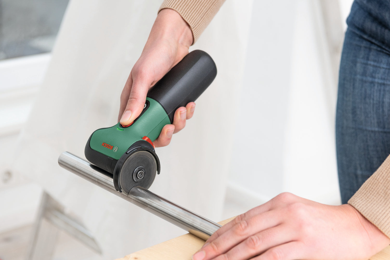 Putting the fun into cutting, EasyCut&Grind is the ideal, compact, multi-purpose cutting tool for versatile and convenient work on wood, metal, plastic, and more. Its small size and easy, secure handling make it the perfect problem solver in many daily cutting situations. Whatever the situation in life, Bosch’s cordless multi-purpose tool EasyCut&Grind has it covered. The strong Li-ion-powered motor and the set of accessories (carbide multi-material cutting disc, metal cutting disc, sanding paper, freehand cutting adapter) ensure multi-functional versatility. The EasyCut&Grind is ideal for convenient, one-handed operation in tight spaces. Its compact size as well as the 2-step activation ensures safe use, no matter the user’s experience level. The tool is ideal for cutting and sanding on wood, metal, plastic, and other materials up to 14 mm. The freehand cutting adapter enhances cutting performance, while simultaneously enabling quick, guided cuts.