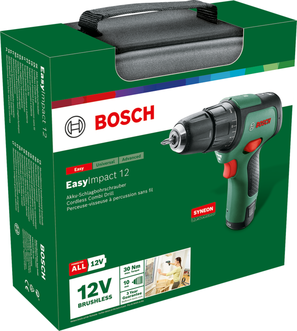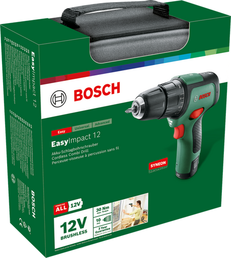 The EasyImpact 12 offers guidance for correct use every time with many intuitive features such as an indicator LED light that shows the rotation direction before drilling or screwdriving, and an intuitive adjustment ring for automatic gear shifts that perfectly match each job. This cordless combi drill is exceptionally intuitive and comfortable. Application modes can be selected via an adjustment ring; an integrated gearshift will automatically change gears as needed. Rotation directions can be changed via its innovative one-click switch system; an indicator LED light shows the selected direction before starting. Its brushless motor delivers power and endurance, making the tool strong and compact. The EasyImpact 12 is the intuitive, straightforward choice for screwdriving, drilling in wood and metal, and impact drilling in brick and limestone. The tool belongs to the 12V POWER FOR ALL system. One battery can be used in all 12V POWER FOR ALL tools.