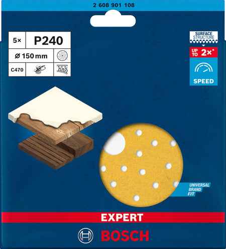 - Bosch EXPERT C470 Sandpaper with multihole for Random Orbital Sanders 150 mm, G 240 5-pc 2608901108