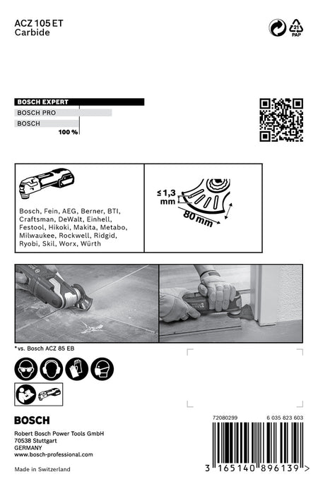 With its wide body and large curve of sharp carbide teeth, the EXPERT ACZ 105 ET Multi Material offers both precision and stability, combined with the extreme durability of Bosch Carbide Technology. Its extremely hard tooth strip, achieved through advanced manufacturing expertise, cuts the toughest and most abrasive materials.