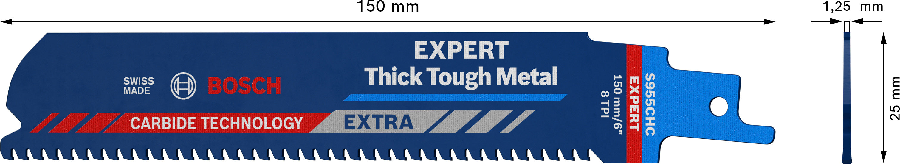Extreme durability is built into the blade with Bosch Carbide Technology. Teeth made of the hardest metal are welded onto an extra robust wide body in thick gauge steel perfect for straight cuts and endurance. Professionals who havent used a Bosch carbide blade before will be astonished at what the Bosch EXPERT Thick Tough Metal Reciprocating Saw Blade can withstand.