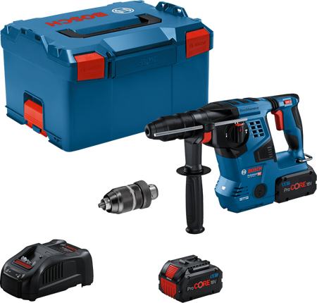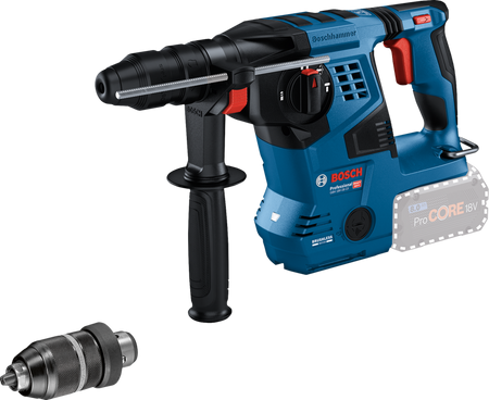 Bosch’s cordless GBH 18V-28 CF Professional is for those who desire corded performance with cordless freedom. This rotary hammer has a powerful brushless motor delivering 3.3 J impact energy from its proven striking mechanism. The easy-to-read HMI displays the tool status and allows the user to choose between three different work modes (Auto, Favorite, Soft) for perfect control in every job and the toolless, quick-change chuck reduces tool downtime. With the optional como module (GCY 42) installed, the GBH 18V-28 CF can connect to Bosch’s Toolbox app to further adjust the setting to suit user needs. Vibration Control, KickBack Control, and compatibility with the GDE 18V-16 for dustless drilling, provides a comprehensive range of user protection features. , This rotary hammer is ideal for hammer drilling in concrete, stone, and masonry. It is compatible with all batteries and chargers in the Bosch Professional 18V System. For a dust-free and safer work environment, the GDE 18V-16 Professional dust extractor can be easily attached. Also compatible with AMPShare, the multi-brand battery alliance. , It also features a storage hook and an LED light.