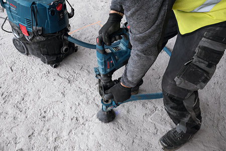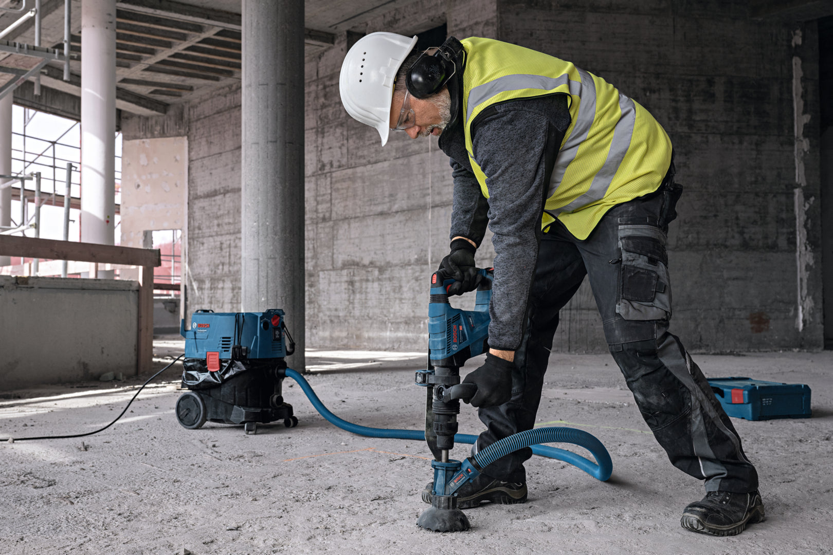 You need a dust solution that is easy to handle and that works with a wide range of applications? The GDE max Professional enables low-dust work on your jobsite and helps to reduce time-consuming cleaning. It is the universal dust solution for nearly all SDS max demolition and rotary hammers and chiselling applications. It comes with a handy attachment for SDS max bushing tools. Working with the GDE max Professional is highly convenient as it gives you the freedom to work in various working positions and allows chisel exchanges without dismounting the dust extraction. It is compatible with the Bosch Click & Clean System as well as with many other systems. , The GDE max Professional dust extraction is perfect when chiseling with SDS max hammers. It is compatible with nearly all SDS max demolition and rotary hammers.
