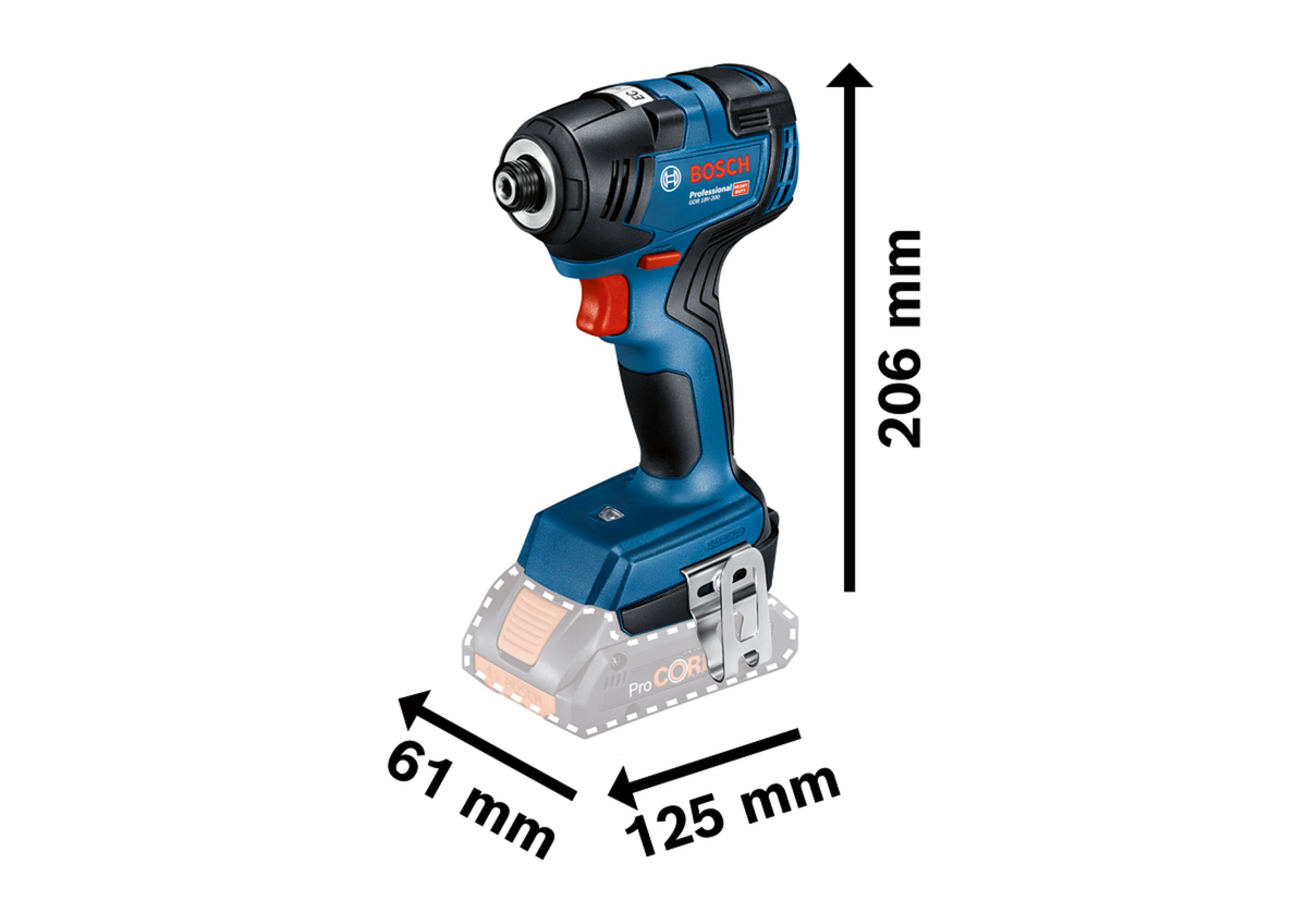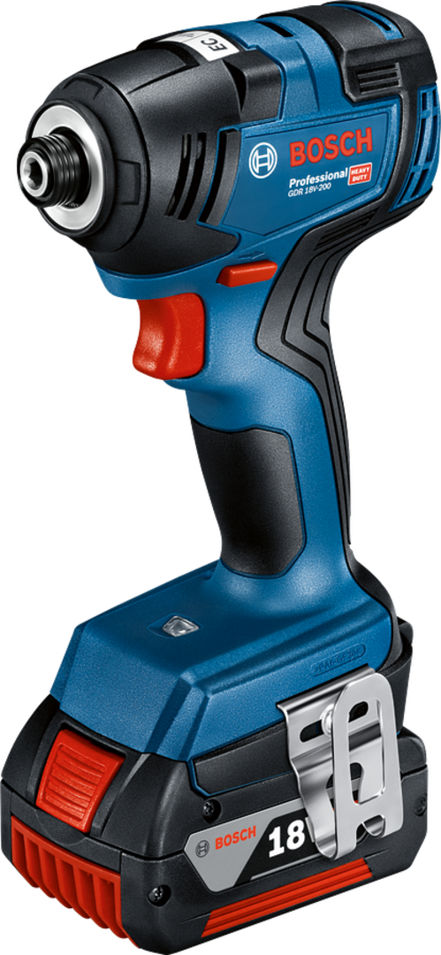 The GDR 18V-200 Professional cordless impact driver offers an excellent power-to-size ratio with ¼” bit holder. With a head length of 126 mm, this cordless impact driver is suitable for even tight spaces. The GDR 18V-200 is equipped with a brushless motor for a strong tightening torque of 200 Nm, excellent battery runtime and a long tool lifetime. For a better control over speed and torque, this cordless impact driver features a variable speed trigger. , The GDR 18V-200 Professional is intended for tightening and removing screws when working in metal sheet, metal and wood. Furthermore, this cordless impact driver is compatible with all Bosch Professional 18 V batteries and chargers (Professional 18V System). Also compatible with AMPShare, the multi-brand battery alliance. , It offers also Electronic Cell Protection (ECP), a LED light and a belt clip.