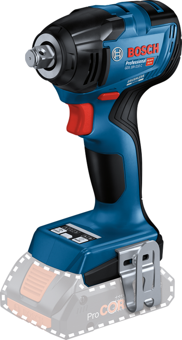 Offering maximum control and damage prevention, the GDS 18V-210 C Professional with 1/2” tool holder is the powerful solution for impact screwing. Two default modes available on the user interface, selftapping screw (A) and wood screw (B), ensure controlled application to avoid broken or stripped off screwheads, worn-out threads, and damage to workpieces by slowing down or shutting off the impact wrench. Each mode can be conveniently adjusted via the Bosch Toolbox App. 210 Nm tightening and 370 Nm breakaway torque deliver top performance. Greater flexibility and control are provided thanks to three different speed/torque settings. , This is the powerful impact wrench for tightening and removing metal bolts and nuts (M 6 - M 16). It is compatible with all Bosch Professional 18 V batteries and chargers (Professional 18V System). Also compatible with AMPShare, the multi-brand battery alliance. , The GDS 18V-210 C Professional comes with a status indicator, LED light, and belt clip for added convenience.