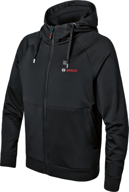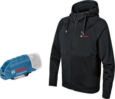 The GHH 12+18V XA heated hoodie poses the perfect mid-layer option to counter cold temperatures and bad weather. When combined with a thin wind-resistant and waterproof jacket, it is everything needed to keep warm, whatever the task at hand. The weather is always unpredictable, but with perfect heat distribution thanks to its three heating zones, this hoodie keeps the body core warm all day. Due to three heat levels, powered with Bosch’s 12 V batteries, long-lasting warmth is always taken care of. The battery adapter’s integrated port makes charging USB-powered devices a breeze, adding further convenience. , The hoodie’s heating pads are powered by the GAA 12V-21 charging adapter (included) and 12 V battery from Bosch or, optionally, by the GAA 18V-48 charging adapter and 18 V battery from Bosch (not included).
