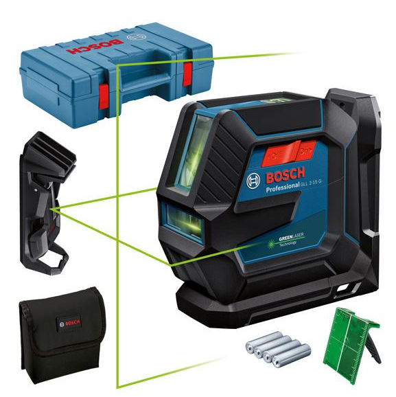 Line laser, 15m, green beam, mount LB 10, 4 x AA batteries, target plate, ceiling clip, pouch, carry case