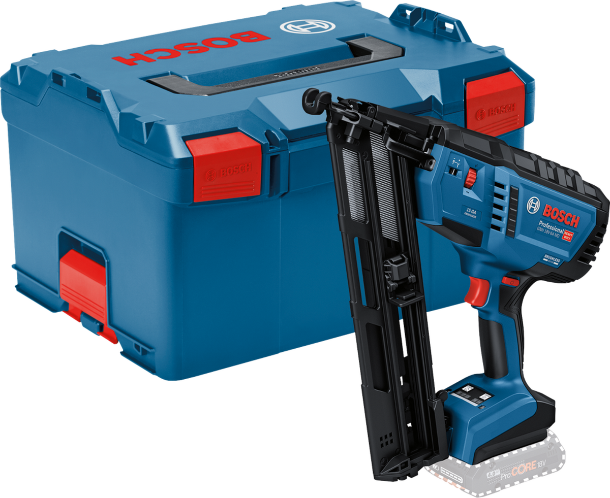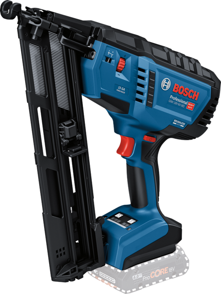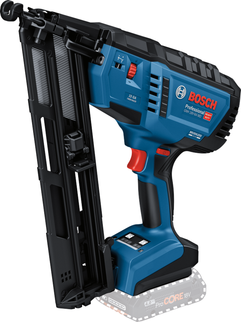 As a professional tradesperson, you want to drive your nails efficiently and without too much strain on your hand and arm. We designed the powerful, brushless GNH 18V-64 MD Professional with very low recoil, so it is gentle on your wrist. We also made sure that you can switch on and operate the tool with just one hand. With this tool, you get the full power of a pneumatic nail gun while being free of compressors, gas cartridges, or cords. , Ideal for attaching windows and door jambs, attaching crown mouldings, installing balusters to stair balustrades, and installing wainscots. Compatible with the Bosch Professional 18V System and with the multi-brand battery alliance AMPShare. , Comes with one-handed power switch, HMI with service alert, single- and contact-activation mode, easy-to-use stepless depth adjustment, dry fire lockout, double LED, wide view contact tip, toolless jam clearing. Use the following nails: 32-64 mm, 15 ga (1.8 mm), and 34° collation angle.