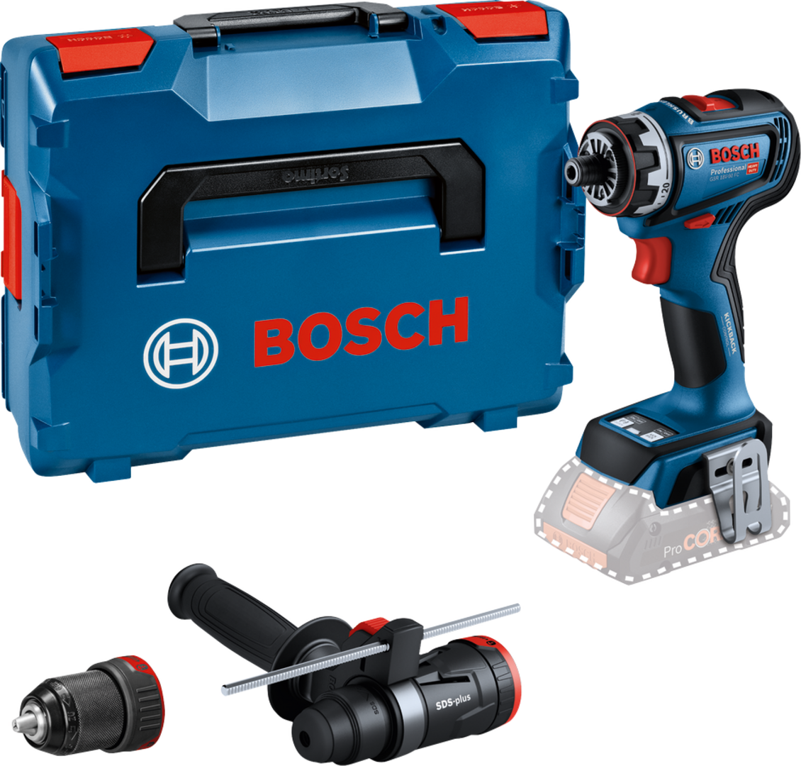 The powerful GSR 18V-90 FC Professional is part of the Bosch Professional FlexiClick System, which prepares for all challenges on the jobsite: The Excenter attachment allows to work closely to edges and walls, while the Right angle attachment turns the drill driver into an angle drill. These attachments can be locked in 16 different positions at a 360° angle, without removing them from the tool. Attaching the unique hammer attachment GFA 18-H turns the tool into a fully-fledged SDS plus rotary hammer, ready for effortless hammer drilling into concrete up to Ø 10 mm. With a head length of only 136 mm and a max. hard torque of 64 Nm, you have a highly compact and powerful tool at hand. The Bosch Professional FlexiClick System – perfectly equipped for a professional job. , It is perfect for all kinds of screwdriving and drilling applications in wood, metal and (combined with the GFA 18-H) concrete, masonry and stone. Compatible with the Bosch Professional 18V System and with the multi-brand battery alliance AMPShare. , It comes with a brushless motor, 2-gear, switchable KickBack Control, switchable Precision Clutch, Electronic Motor Protection and it is Bluetooth® Connectivity ready.
