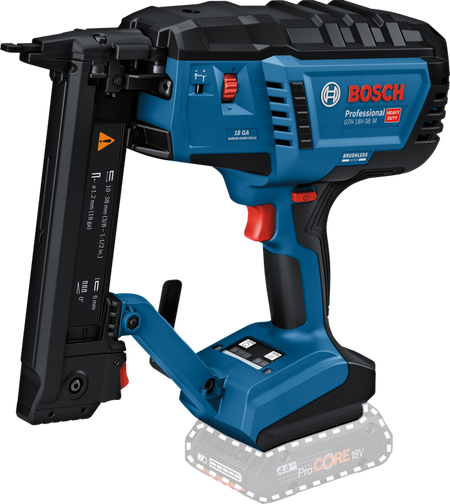 As a professional tradesperson you want to drive your staples efficiently and without too much strain on your arm and hand. We designed the powerful, brushless GTH 18V-38 M Professional with very low recoil, so it is gentle on your wrist. We also made sure that you can switch on and operate this crown stapler with just one hand. The GTH 18V-38 M Professional gives you the full power of a pneumatic tool while being free of compressors, gas cartridges, or cords. , Ideal for installing tongue-and-groove ceiling and floor panels (secret nailing), attaching furniture back panels, upholstery, mounting of fences made of wire or thin slats, mounting of trellis, or attaching acoustic insulation material. Compatible with the Bosch Professional 18V System and with the multi-brand battery alliance AMPShare. Comes with one-handed power switch, HMI with service alert, single- and contact-activation mode, easy-to-use stepless depth adjustment, dry fire lockout, double LED, wide view contact tip. Use the following staples: 9.5-38 mm, 5.8 mm crown, 18 ga (1.2 mm), and 0° collation angle.