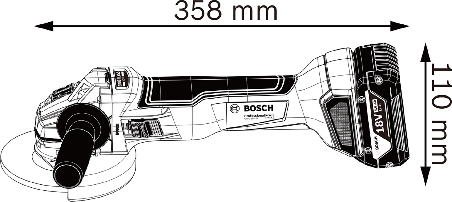 The GWS 18V-10 Professional cordless small angle grinder offers an improved level of power and tool control in the 18 V category. It delivers cordless power equal to a 1,000 W corded grinder thanks to its powerful brushless motor and ProCORE18V technology. Equipped with Drop Control, KickBack Control, and intelligent brake system, this small angle grinder offers an increased level of user protection and convenience. It features the worlds first Drop Control function, which shuts the grinder off immediately when accidentally dropping it on the floor. This tool is suitable for cutting and grinding metal, stone, and concrete. It is compatible with all Bosch Professional 18 V batteries and chargers (Professional 18V System). Also compatible with AMPShare, the multi-brand battery alliance. , The GWS 18V-10 Professional also features a keyless nut.
