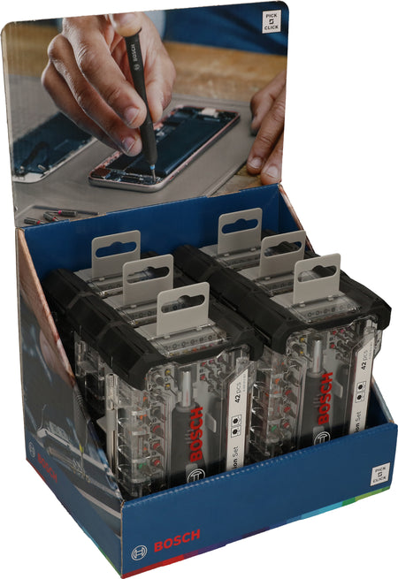 Designed for professionals who repair devices with precision and standard screws - Precision screws with special head types are often used in small devices. Precision screwdriver bits come in handy when you need to repair a smartphone, laptop, or small kitchen appliances. Our comprehensive Precision Screwdriver Bit Set has all the bits you need for any precision and standard screwdriving task. 20 precision bits, 20 standard bits, and two magnetic handles to hold bits securely: the Precision Screwdriver Bit Set offers bits for most screws, including precision screw bits with special head types. All head types are colour-coded to help you pick the bit you need. The set is housed in a strong Pick and Click case with a transparent lid. 1/4 Impact rated Hex shank for use in impact driver and drill driver