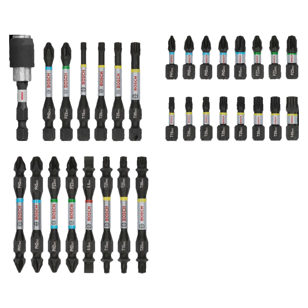 Up to 50x more robust than a Bosch 2607001528 Extra Hard Bit - Looking for a compact and reliable screwdriver bit set you can use for tough applications? Try the PRO Impact Set. It includes bits you need for most screwdriving applications. The PRO Impact Set is a great choice for installers who need robust, heavy-duty screwdriver bits. The bits are made from heat-treated modified steel for outstanding strength and resistance to high torque. Their torsion zone absorbs the torque stress at the bits’ tip to ensure they won’t break. They have colour-coded rings indicating the head type and laser markings helping you pick out the size you need. They are housed in a sturdy case and arranged in holders you can use to build your own toolbox. 1/4" Impact rated Hex shank for use in impact driver and drill driver.