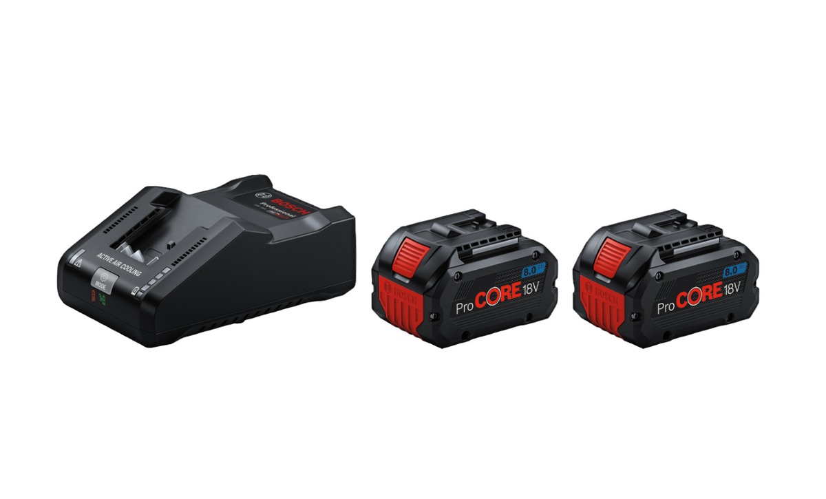 This set consists of two ProCORE18V 8.0Ah battries for up to 2,000 W corded power and the ultra-fast charger GAL 18V-160 Professional. ProCORE18V batteries offer 87 % more power compared to a conventional battery because of cell technology with the 21,700 cells and Bosch´s intelligent battery management. Additionally, they are equipped with the COOLPACK 2.0 technology for superior heat management. This leads to a longer lifetime and runtime of the ProCORE18V batteries. The GAL 18V-160 Professional is our ultra-fast 18V battery charger. It comes with a standard mode and additional charging modes to boost your productivity and save time. Thanks to a charging current of 16 amperes, it will take you only 15 minutes to get your ProCORE18V 8.0Ah up to 50 % capacity – that’s especially convenient if you need to finish a few jobs before the end of the day. Get a full charge during your break – the highest speed boosts your battery in only 44 minutes.