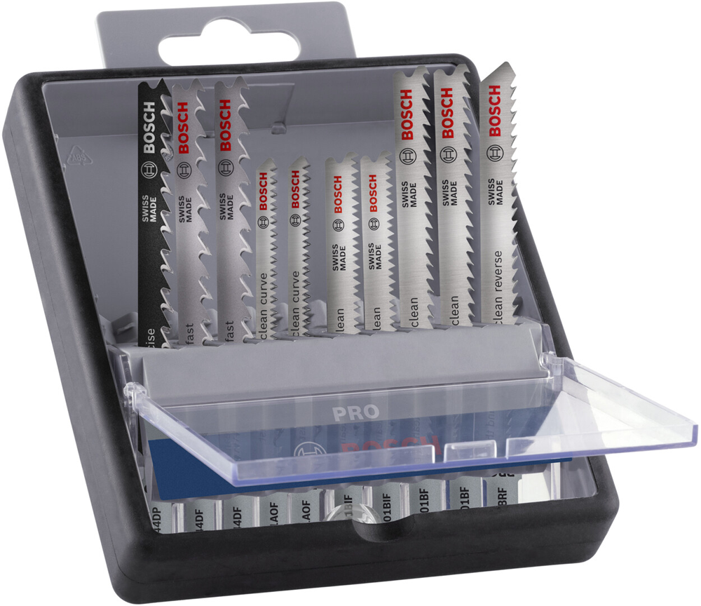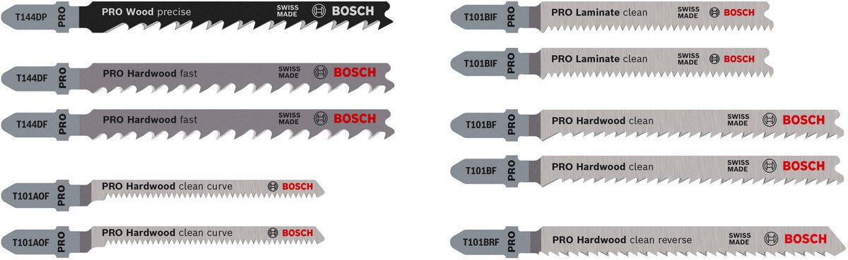 The PRO Hardwood and Laminate Set includes jigsaw blades made from high-carbon steel (HCS) and Bi-Metal. The Bi-Metal blades feature a high-speed steel (HSS) tooth strip bonded with a high-carbon steel (HCS) body for strength and durability. The blades have different shapes and tooth geometries to ensure you can tackle a variety of wood and laminate applications with ease.