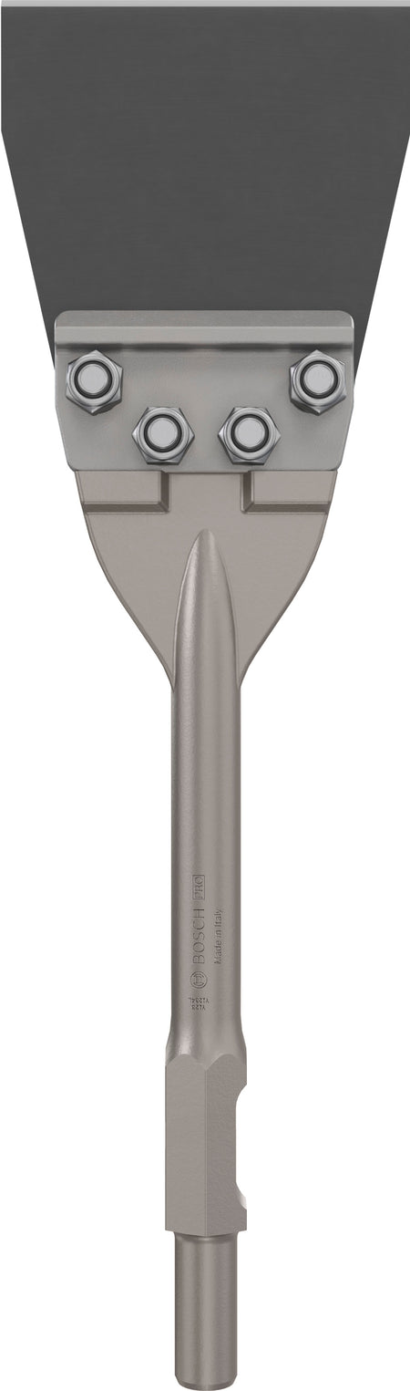 Designed for removing flooring materials - Are you a renovator who need an effective floor scraper to remove floor coverings? Try the PRO HEX 30 Floor Scraper. It will help you remove all types of flooring materials fast. The heavy-duty PRO HEX 30 Floor Scraper has a wide cutting edge made from durable steel to ensure it lasts long and removes more material than smaller blades. The blade is secured to the shaft with bolts and nuts to reduce vibrations. The scraper fits the GSH 16-30 breaker. You can use it with our GHT 130 Professional floor removal cart to work effectively with less strain. Fits breakers with 30 mm hex shank