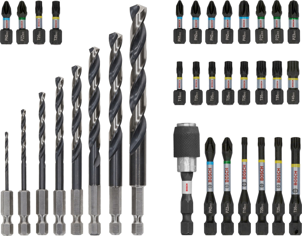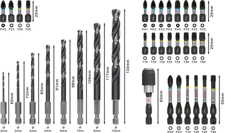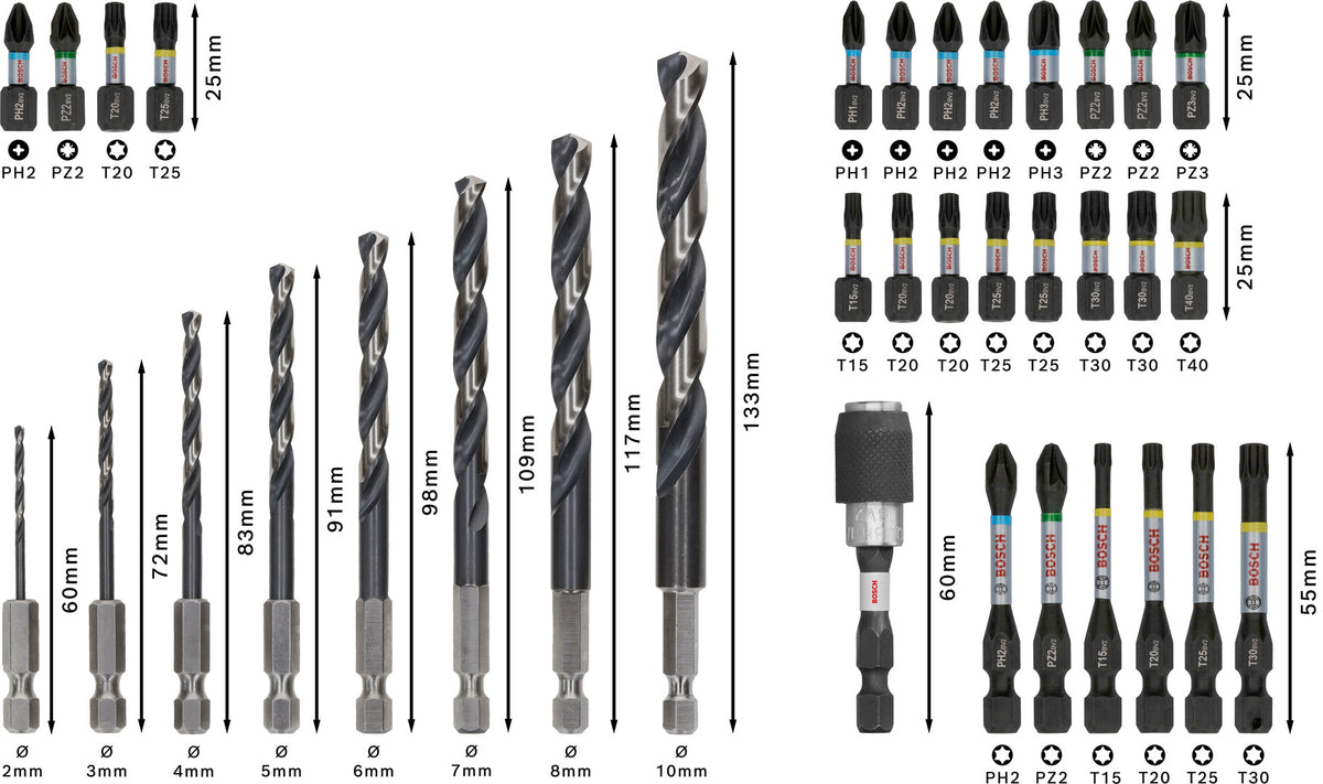 T15; T20 (3x); T25 (3x); T30 (2x); T40 - 55 mm Screwdriver Bit: