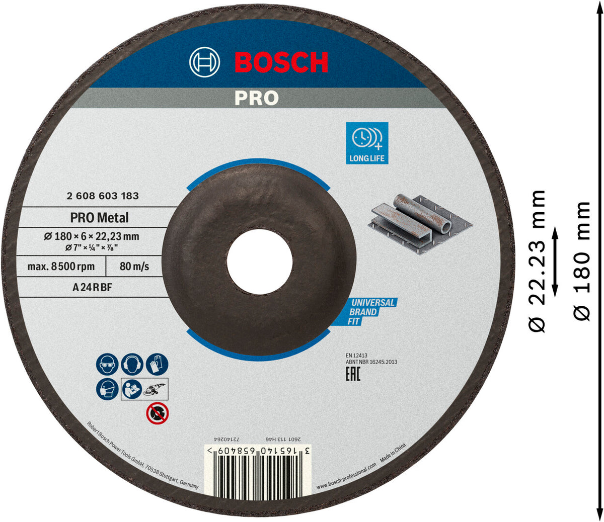 The durable PRO Metal Bonded Grinding Disc uses high-quality aluminium oxide grains to grind metal and steel efficiently. The grains, combined with functional fillers and embedded in a phenol resin matrix, ensure strength, resistance to heat, and stable performance. A precision-made fibreglass net reinforces the disc for additional safety.