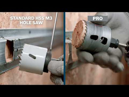 The PRO Multi Material Hole Saw has enhanced tooth design for fast and smooth cuts and high-cobalt HSS alloy teeth for longevity. It tackles steel cladding and drywall effectively. The Power Change plus makes changing hole saws and pilot drill bits faster and removing material plugs easier.