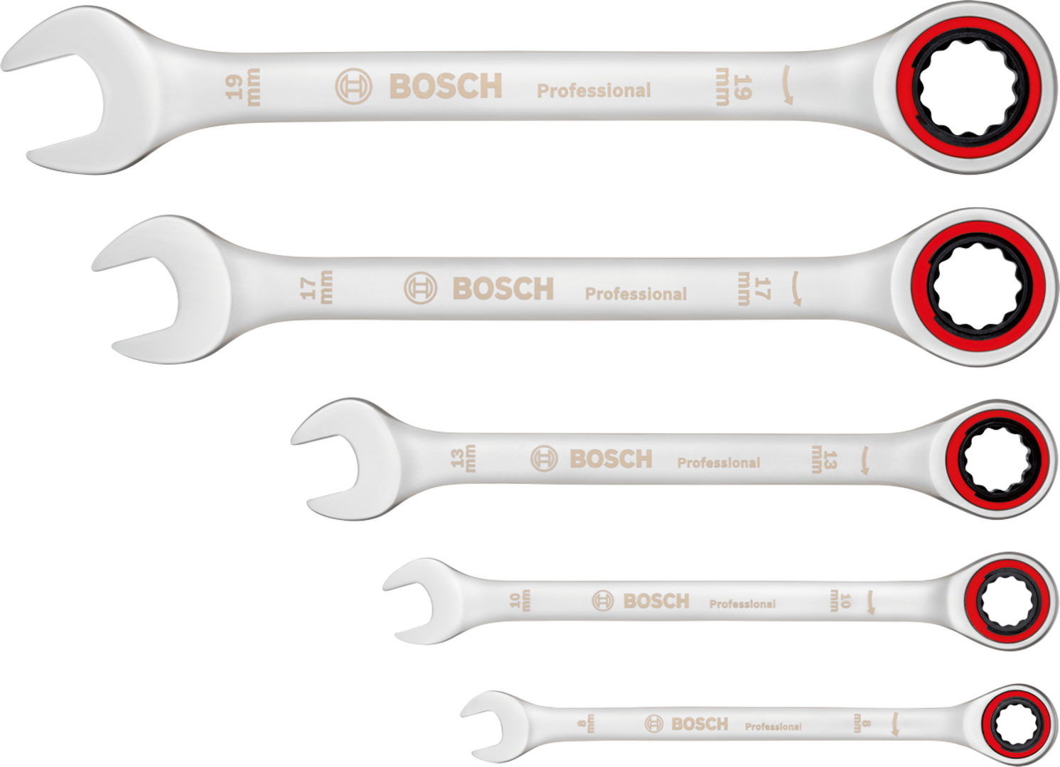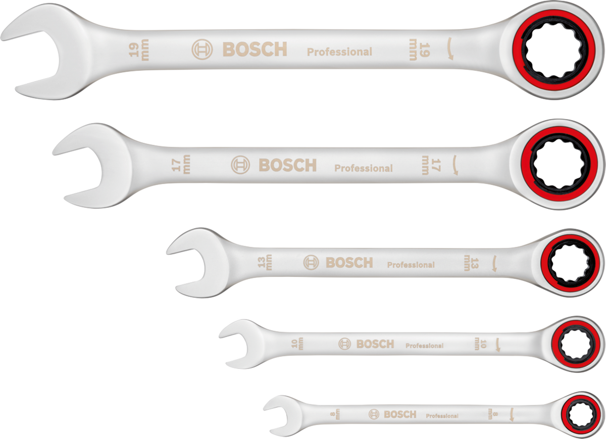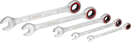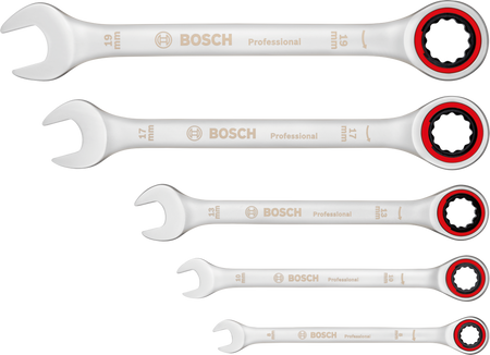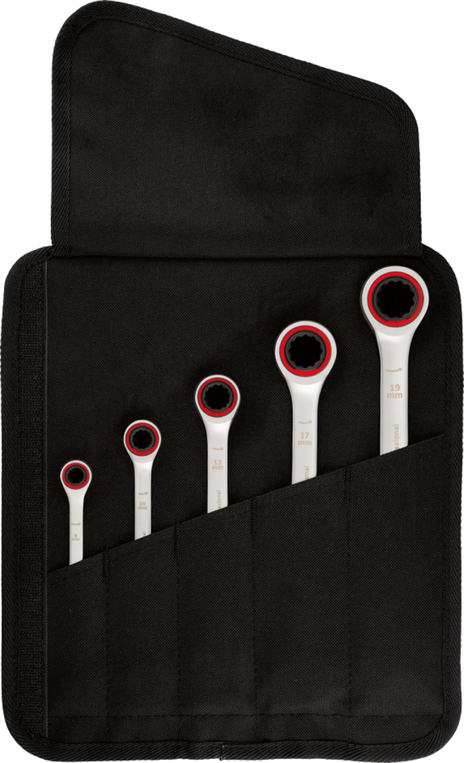 The versatile 5-piece set includes ratchet spanners in the standard sizes 8mm, 10mm, 13mm, 17mm and 19mm. All spanners can be used for a wide variety of applications as every spanner combines an open-ended with a ratchet ring spanner in one single product. The spanners are perfectly suited for work in tight spaces as the toothless ratchet only requires a backswing angle of less than 1 degree. Our spanners are manufactured from high-quality chrome vanadium steel with a hardened bi-hexagonal ring and are very robust and long lasting. The ratchet spanners are designed for precision applications for light and medium torque applications. For high torque applications, the open end wrench should be used.This versatile 5-pieces set comes in a handy folding canvas bag.