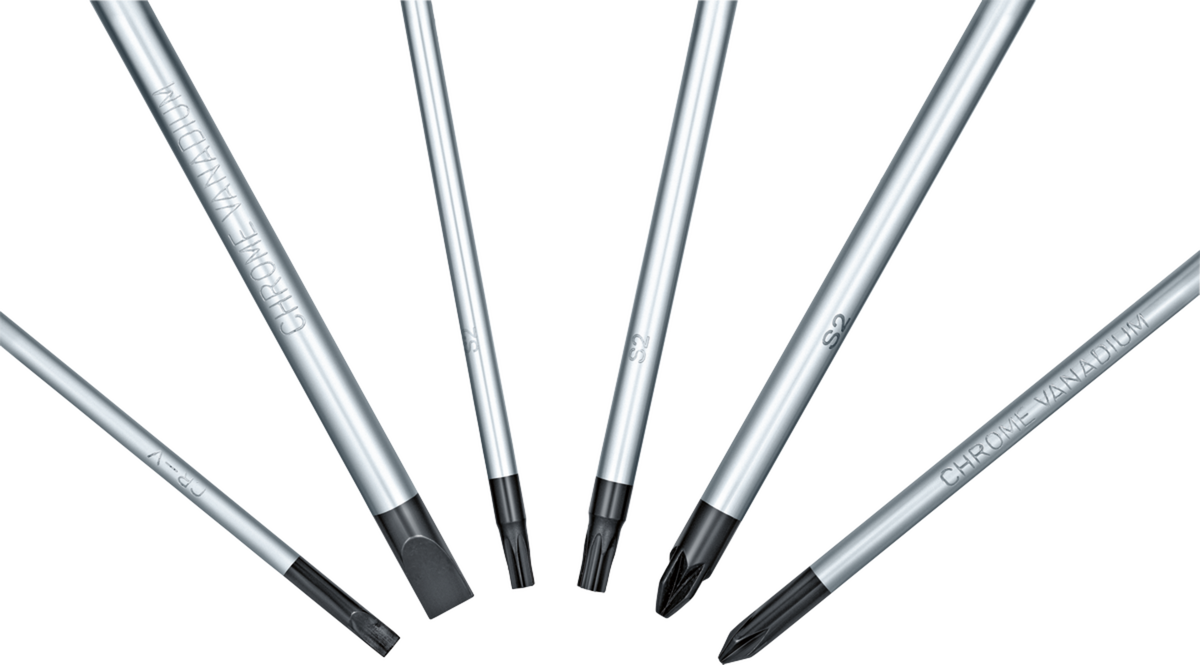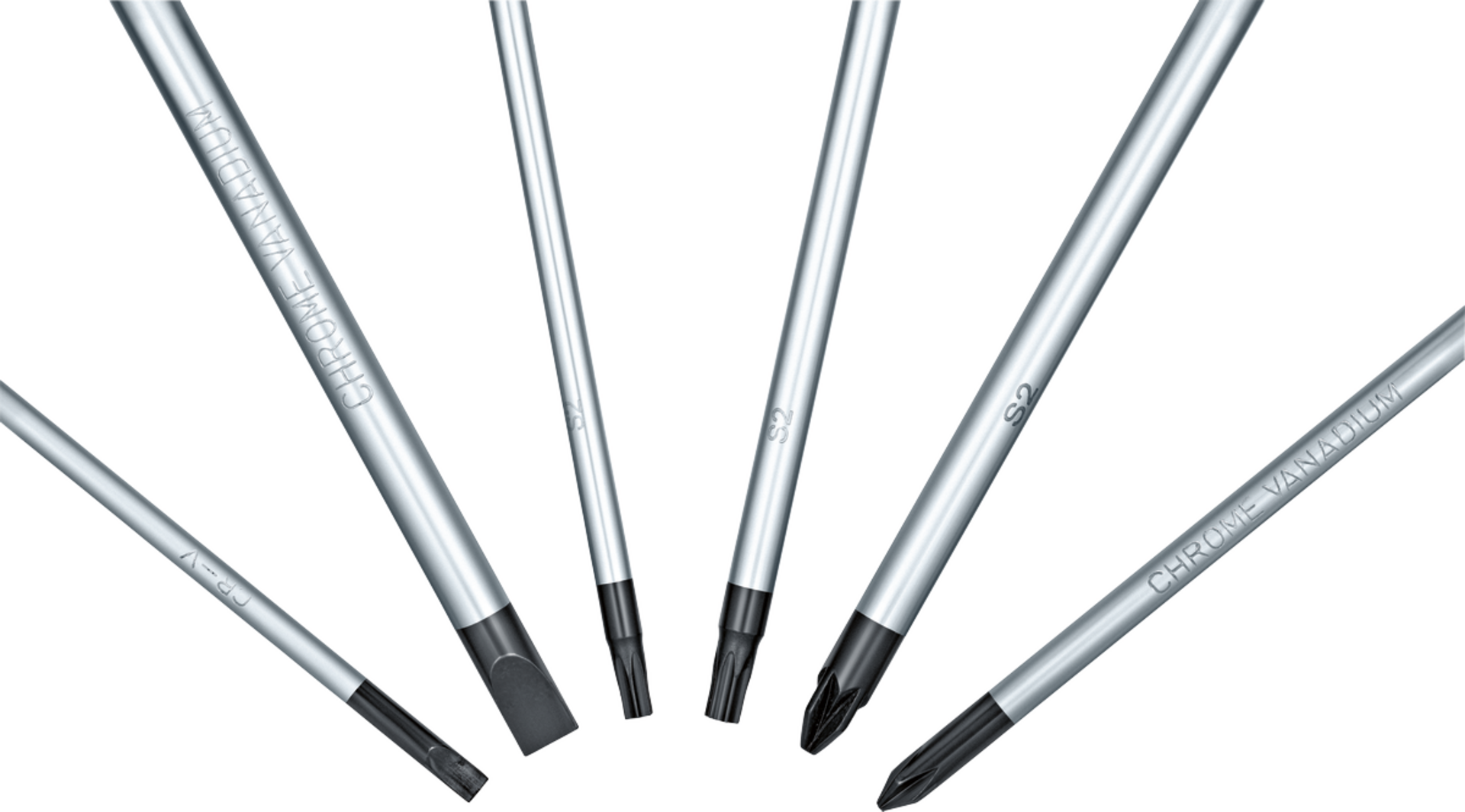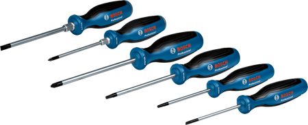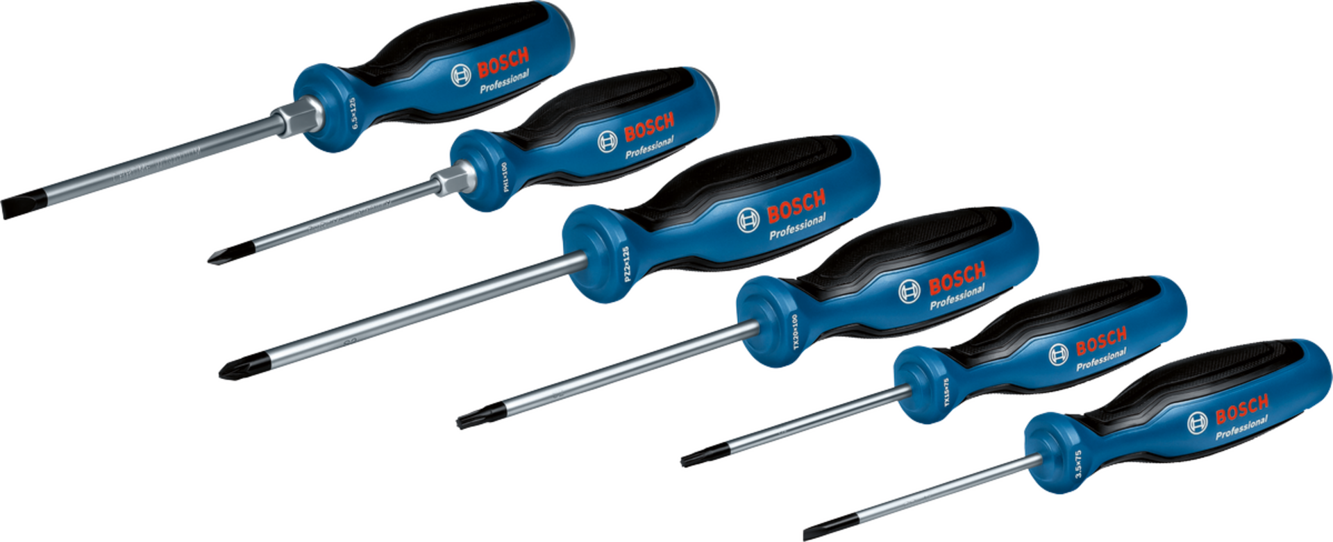 Three different screwdriver sets consisting of 6 screwdrivers per set. Set #1 (1600A016BF) consists of 4x SL and 2x PH screwdrivers. Set #2 (1600A01V09) contains 6 TX screwdrivers and set #3 (1600A02CV3) includes 2x TX, 2x SL, 1x PZ, 1x PH screwdrivers. Thanks to their metal shafts, all screwdrivers are robust and support long service life. The high-precision tips ensure exact working results with all screwdrivers. Furthermore, soft grips and ergonomic shapes assist comfortable usage. , Fastening and unfastening of various kinds of screws (Phillips, slotted, Torx, and Pozidriv), chiselling with those screwdrivers that are equipped with a metal end cap (SL 4,5; 5,5; 6,5; PH1 and PH2).