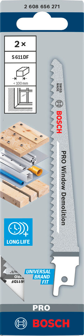 The PRO Window Demolition S611DF recip saw blade's robustness comes from its Bi-Metal build, pairing a thick gauge HCS body with hardened HSS teeth. The tapered design is perfect for tackling awkward to get at points so professionals can pick the best point to cut through a frame to remove it.