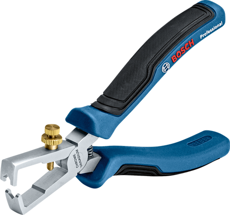 The Bosch Professional 160-mm wire stripper, with its adjusting screw and spring-action shanks, can be precisely adjusted to strip cables up to 10 mm2 in diameter. The robust chrome vanadium steel shanks are ideal for repetitive stripping and are long lasting. Thanks to the ergonomic-shaped handles, with their soft grip and anti-slip shoulders, and the opening spring, the wire stripper is comfortable and safe to use, especially one-handed.