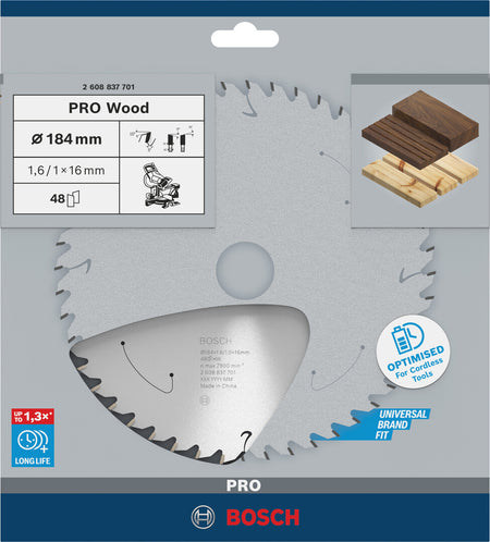 We made the PRO Wood cordless Circular Saw Blade for woodworkers who use cordless mitre saws to cut all types of solid wood and wood-based panel materials. Thanks to its extra-thin kerf, it works with less friction, uses less energy, and extends your battery runtime. Our wood circular saw blade features strong carbide teeth to ensure you get precise cuts and exceptional performance for a long time.