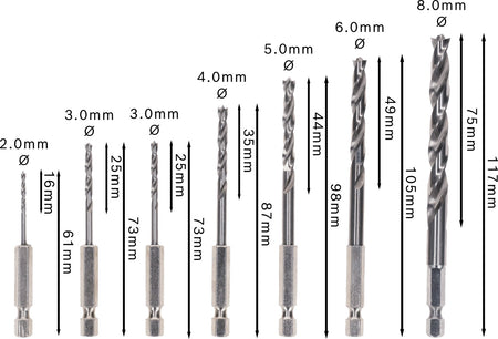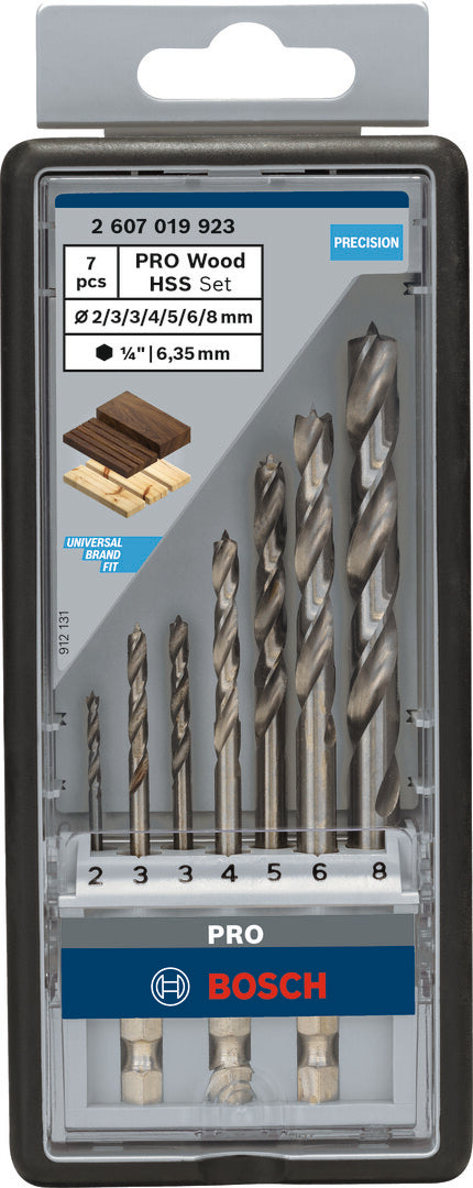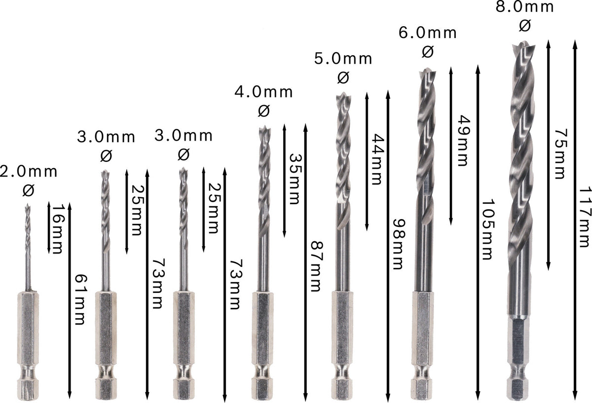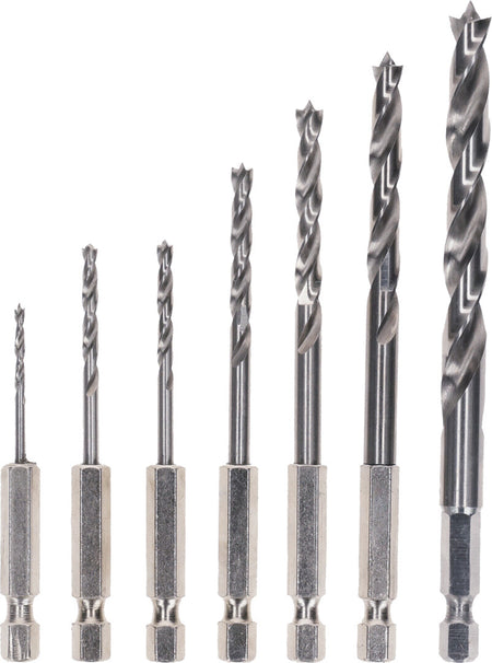 The PRO Wood HSS Brad Point Drill Bits bring solution to your woodworking challenges. We made them from high-speed steel (HSS), which means they are hard-wearing and resistant to heat. Their centering tip, or Brad Point, ensures you can start holes precisely where you need them. The holes are round and splinter-free due to sharp cutting spurs at the tip of the drill bit. The two-flute design helps remove chips and prevents them from clogging the holes, make your drilling fast and efficient.