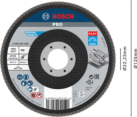 The PRO X571 Flap Disc has an X-cloth backing for stable grinding. The advanced grain fusion of aluminium oxide and zirconia offers fast stock removal and makes this flap wheel efficient, even when you use it on hardened steel.