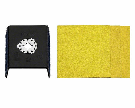 The Bosch AUZ 70 G is a Starlock mounted profile sander with a micro Velcro-type fastening system for easy changing of sanding paper. Ideal for sanding applications on wooden curved and painted surfaces up to ø55mm. Supplied with 4 sheets of sanding paper 70mm x 125mm with Velcro (2x80 / 2x120 grit). Compatible with GOP Multi Cutters and other oscillating multi functional tools with Starlock mounting system.