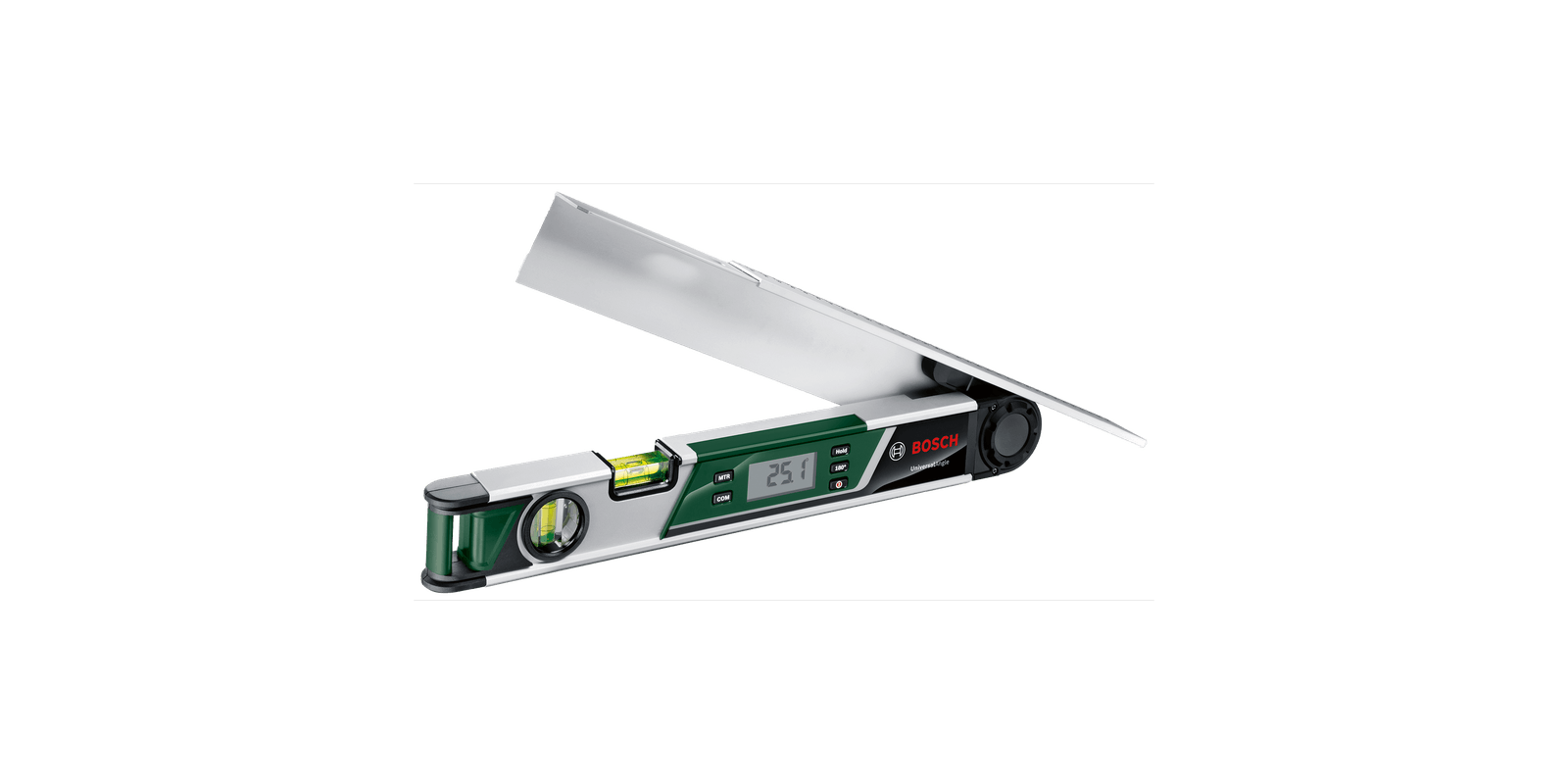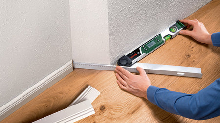 The UniversalAngle delivers fast and easy measurements, calculations, and transfers of angles. It features a practical sliding leg that extends up to 35 cm for measuring supplementary angles in hard-to-reach corners, making it the ideal tool for flooring installations and tiling. Integrated measuring functions help to conveniently calculate simple and compound mitres that facilitate precise compound saw adjustments to the required angles – perfect when installing skirting boards and crown mouldings.