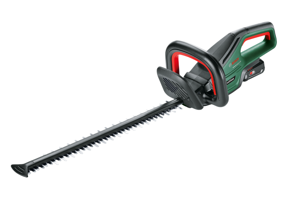 The Bosch UniversalHedgeCut 18-50 is perfect for trimming medium-sized hedges. It features Bosch Quick-Cut Technology that ensures clean cuts every time. A powerful 18 V Lithium-ion battery provides cordless mobility with an optimal power performance. Its multi-position front handle enables convenient and comfortable working in any position. A 50 cm blade with 20-mm tooth opening and the Bosch Anti-Blocking System enables powerful and continuous cutting without the risk of stalls. It has a blade-tip saw for branches of up to 25 mm wide and a blade tip protector for the safe cutting along walls and paths.