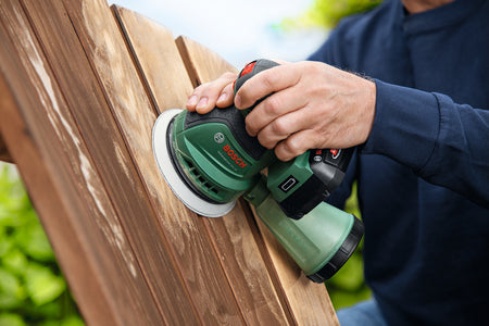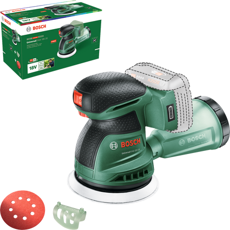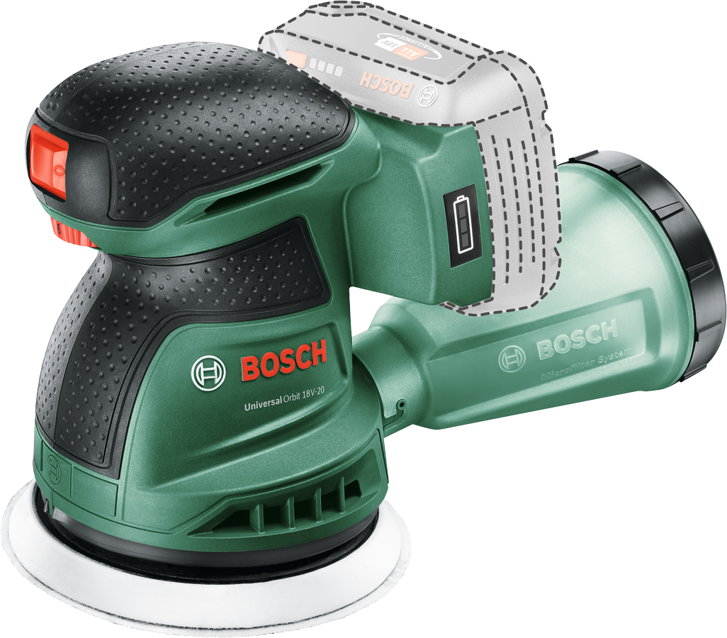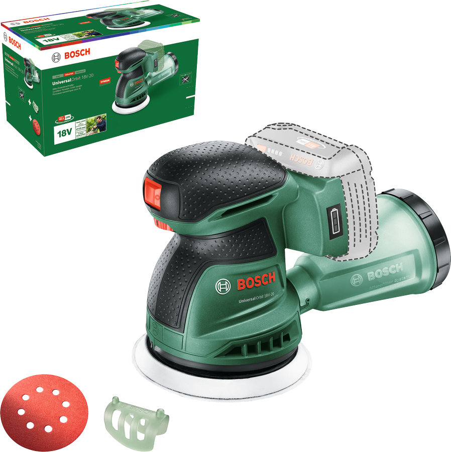 The Bosch UniversalOrbit 18V-20 random orbital sander ensures a high-quality sanded or polished finish on floors, furniture and other large flat or curved surfaces. With its powerful motor and electronic speed selection, sanding is efficient and speed can be adjusted precisely to suit a variety of different materials including wood, plaster, varnished or polished areas. The state-of-the art microfilter dust box minimises dust, ensuring a cleaner workspace and more comfortable handling. The built-in Bosch Syneon Electronic protects your tool and battery. The tool belongs to the 18V POWER FOR ALL system. One battery can be used in all 18V POWER FOR ALL tools.