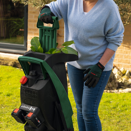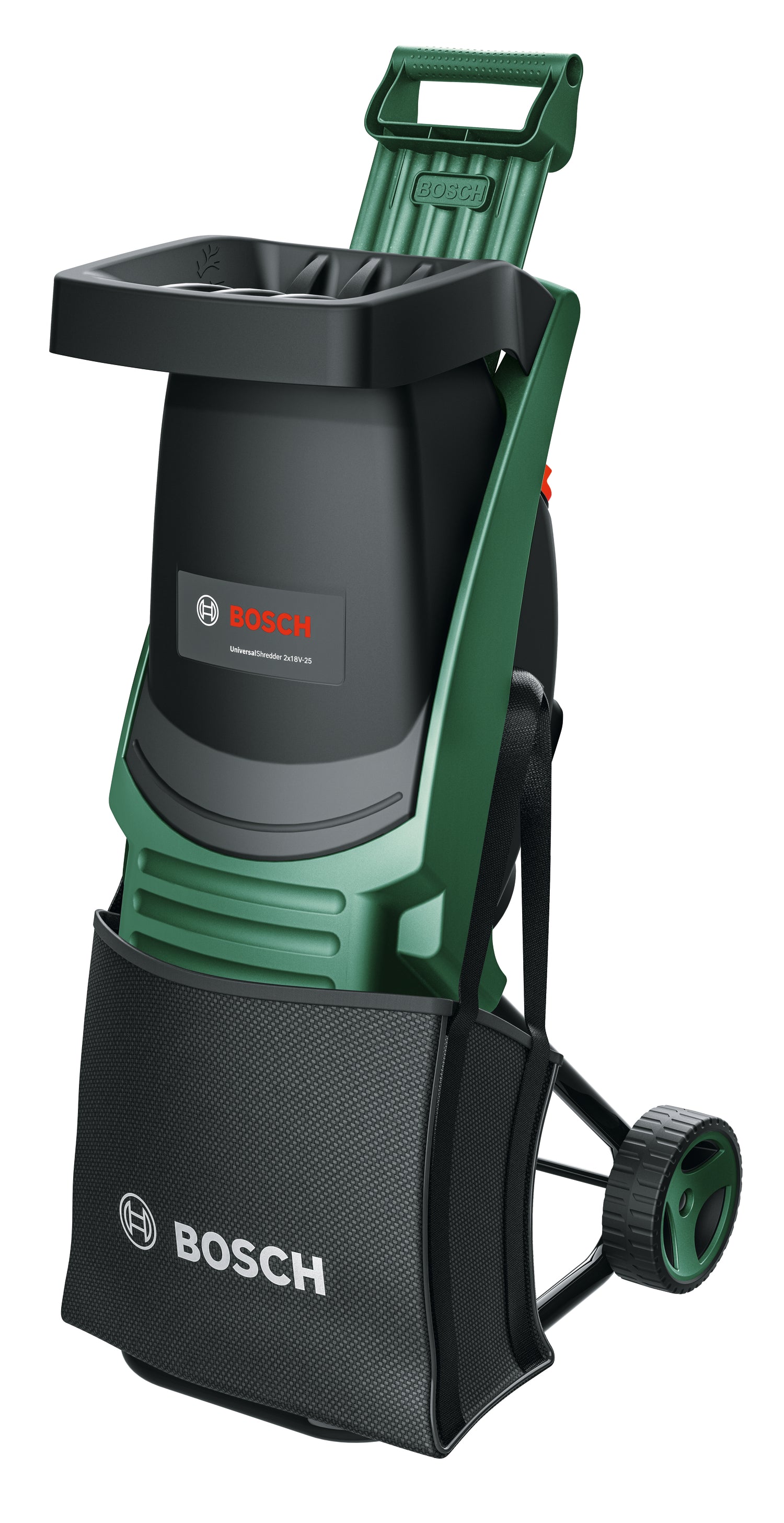 The Bosch UniversalShredder 2x18V-25 has multiple features that make it the tool of choice for the quick shredding of shrubs, branches, and other garden debris. It’s 2x18V batteries deliver 36V performance. A powerful Brushless motor and OptiCut automatic speed control enable it to shred continuously and uninterrupted. Blades made of extra-hardened steel can cut branches up to 25 mm thick. The double-edged blade can also be reversed for prolonged usage. Larger garden debris can be safely pushed into the fast-feed hopper with the help of a practical prodder. Thanks to its lightweight design and lack of a mains power cable, this high-performance garden shredder is quick to set up, easy to transport across lawns and patios and enables you to shred wherever you need to, directly into the high-quality 28 l fabric collection bag provided. The tool belongs to the 18V POWER FOR ALL ALLIANCE. One battery compatible with 10+ brands and 100+ tools. It offers the greatest application variety for your Home & Garden.