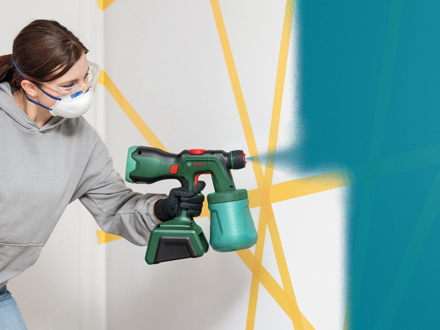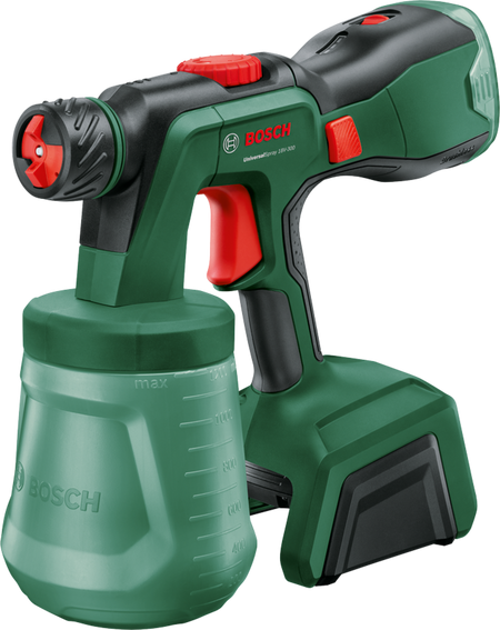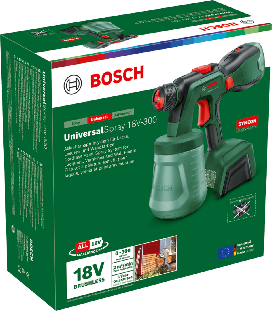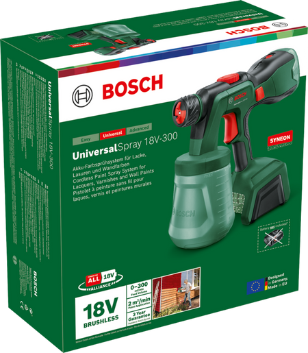 Around the house and outdoors, painting jobs are fast and easy with the UniversalSpray 18V-300. This powerful, portable paint sprayer has one ALLPaint nozzle for spraying varnishes, lacquers, wall, and all kinds of paints to deliver an excellent painted finish. For a high-quality painted finish in no time, beginner and advanced DIY enthusiasts will enjoy the cordless portability and simple operation of the UniversalSpray 18V-300 paint sprayer. This is a highly versatile tool with one ALLPaint nozzle and a brush motor for powerful spraying of lacquer, varnish, wall, or any kind of paint. With the convenient EasySelect thumb wheel, paint volume can be adjusted and there’s a 2-step speed setting for switching from wood to wall paint. Refilling the paint container is quick thanks to its ergonomic shape. There’s an SDS button for simple separation of the front and back parts of the tool, enabling effortless cleaning. Built with SYNEON technology, this sprayer is energy efficient with a long runtime, so time is saved when painting big areas.The tool belongs to the 18V POWER FOR ALL system. One battery can be used in all 18V POWER FOR ALL tools.